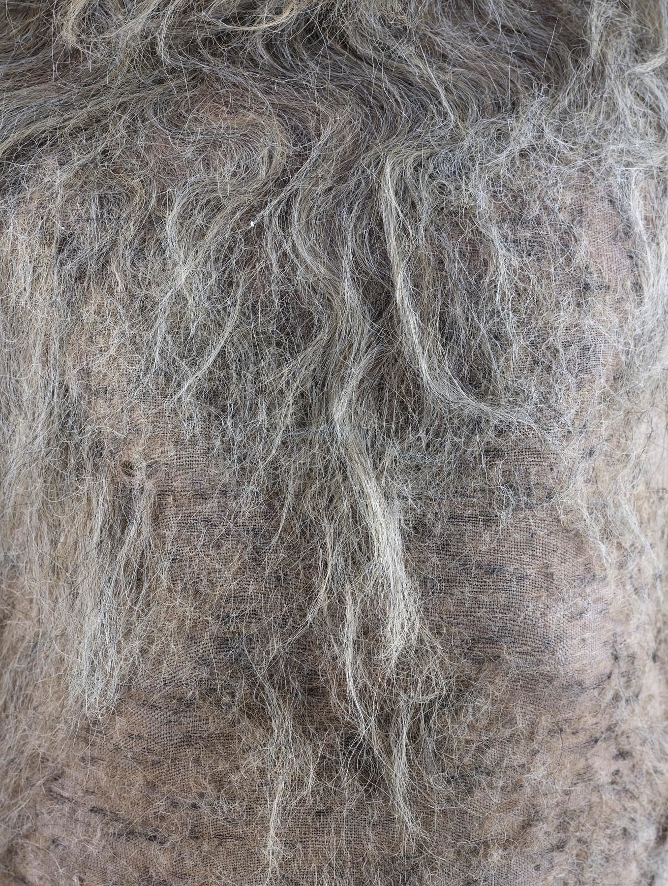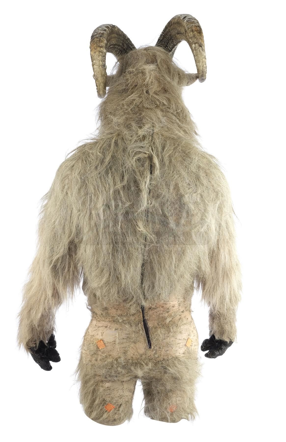 This mask is constructed from plastic, foam latex, synthetic hair, foam, resin, and acrylic components to resemble a goat's head, while the matching hairy bodysuit features foam, Spandex, and mixed fabric components, including several orange motion-tracking squares affixed. Also included for display are a black fiberglass torso cast, a white styrofoam bust, and a wardrobe bag. This lot is in good overall condition with various signs of wear from production, including stains, minor deterioration to the latex, and a missing tooth.