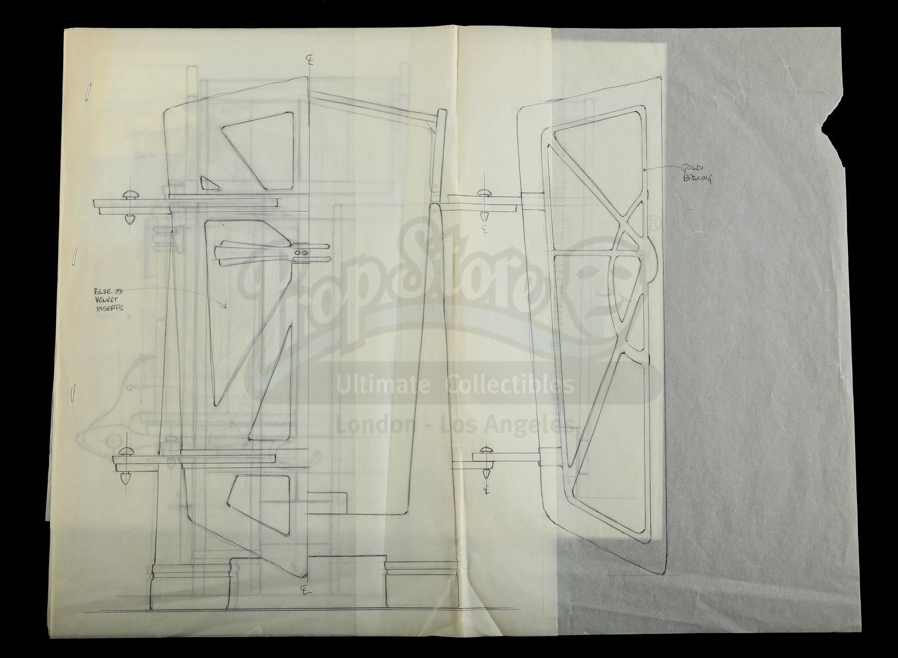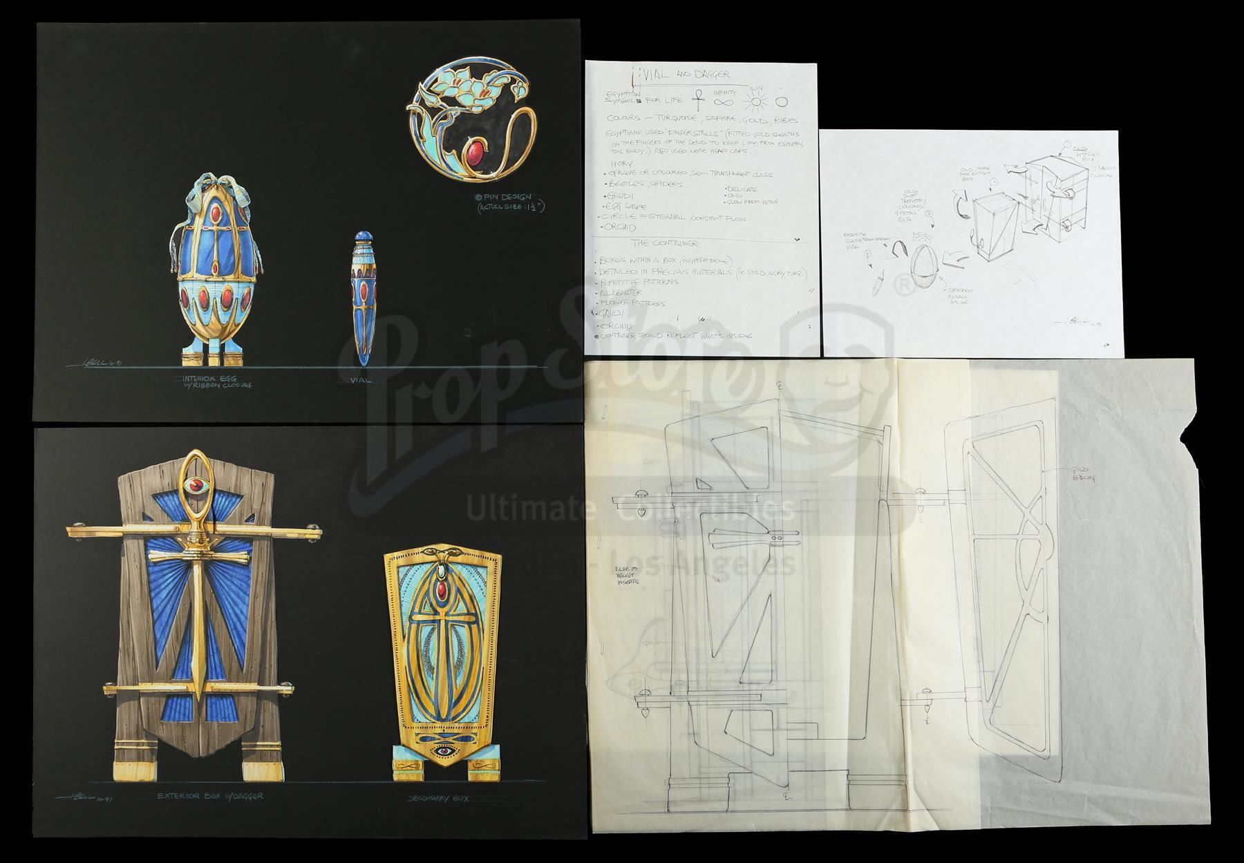 The lot consists of two black illustration boards with affixed hand-colored concepts for the outer and inner box, egg, vial, and pin; one page of handwritten notes, one page of ink on paper drawings illustrating the nesting effect of the prop, and six stapled pages of pencil and pen drawings on vellum depicting the various elements of the prop in larger detail. Some pieces are signed "J. Bell 10.91." The larger vellum sheets are folded in half and the lot is in excellent overall condition with minimal wear from use and age. Dimensions: (largest) 20" x 15" (51 cm x 38.25 cm); (smallest) 8 1/2" x 11" (21.75 cm x 28 cm)