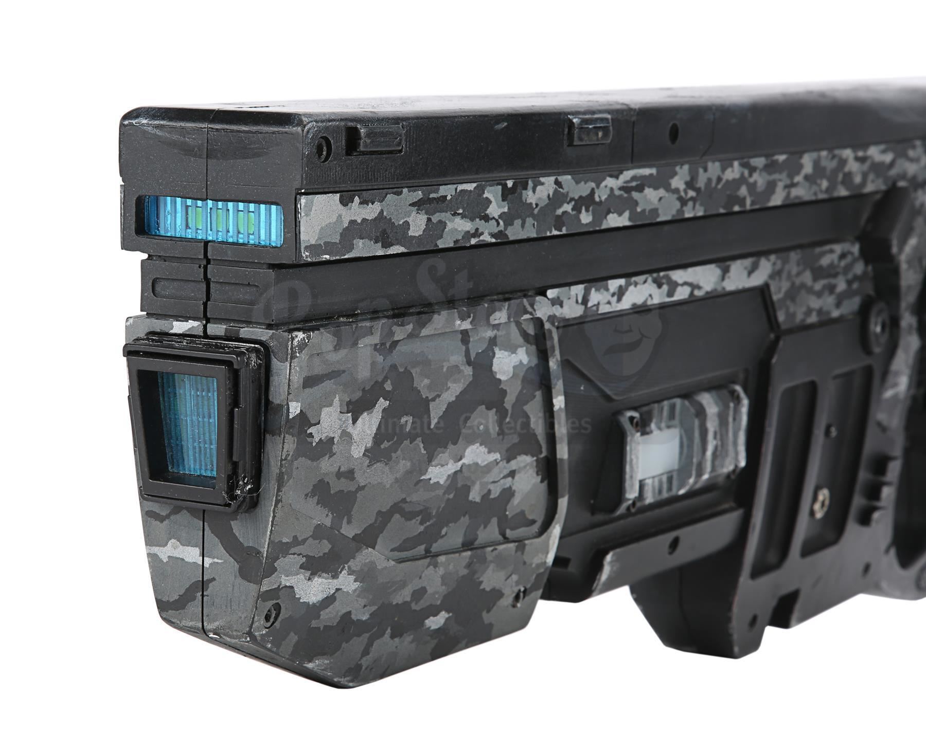 A light-up hero rifle from Robert Schwentke's sci-fi dystopia Divergent: Allegiant. Rifles were carried by soldiers working for the Bureau of Genetic Welfare, and Tris (Shailene Woodley) used one during the climactic scenes. The rifle is made predominantly of resin and is painted with grey camouflage. A small switch at the bottom of the rifle activates the lights, illuminating the sides and top of the weapon. When the trigger is pulled, the weapon makes a noise and the barrel and side panels flash.