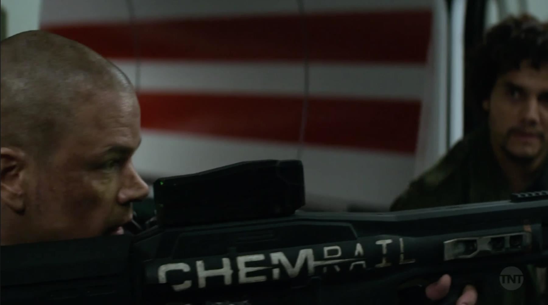 A light-up hero Chemrail rifle from Neill Blomkamp's sci-fi adventure Elysium. Security forces on Elysium carried standard-issue TST Chemrail rifles.