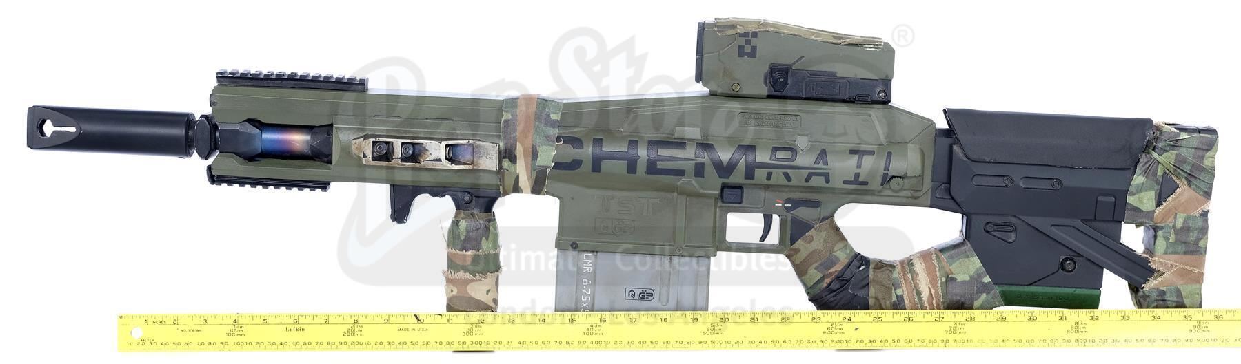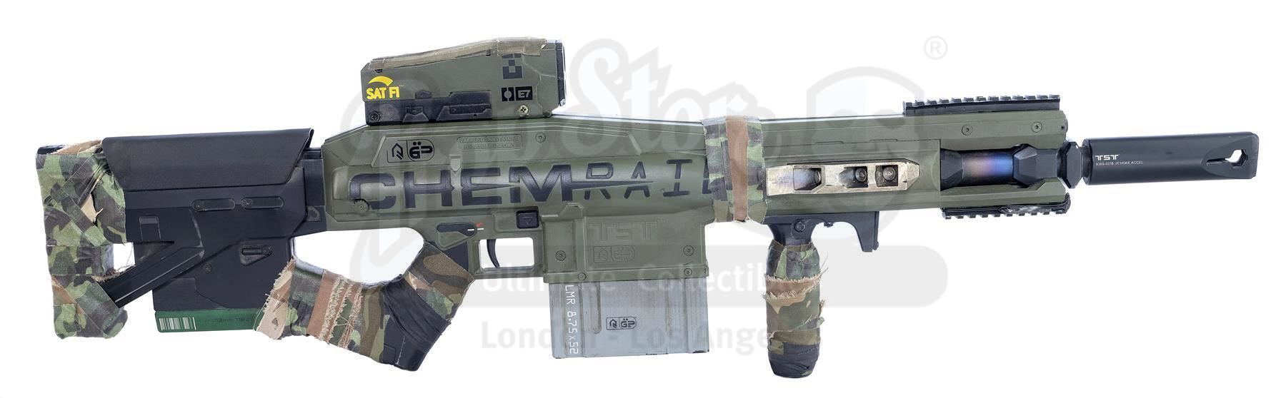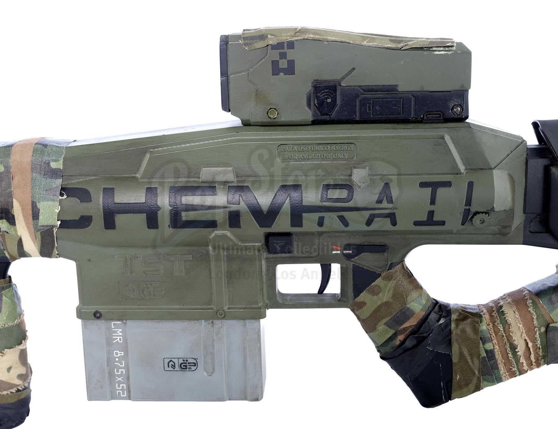 Designed by Weta Workshop, this futuristic rifle consists of a hand-painted black and silvertone fiberglass body with orange, green, and yellow details, a metal ammunition magazine and metallic barrel, and "CHEMRAIL" and "For Asgari Use Only" engraved on the sides. It was built with several practical mechanisms, including an electronic recoil and CO2 gas-emitting mechanism, an illuminating scope screen and an additional light mounted to the prop's frame.