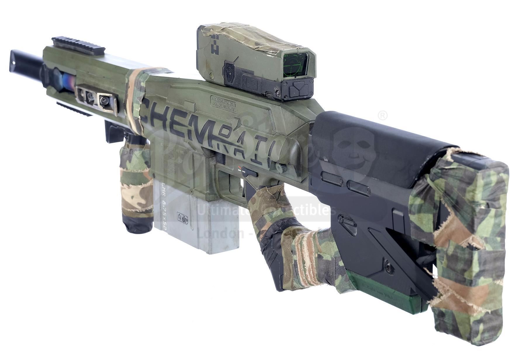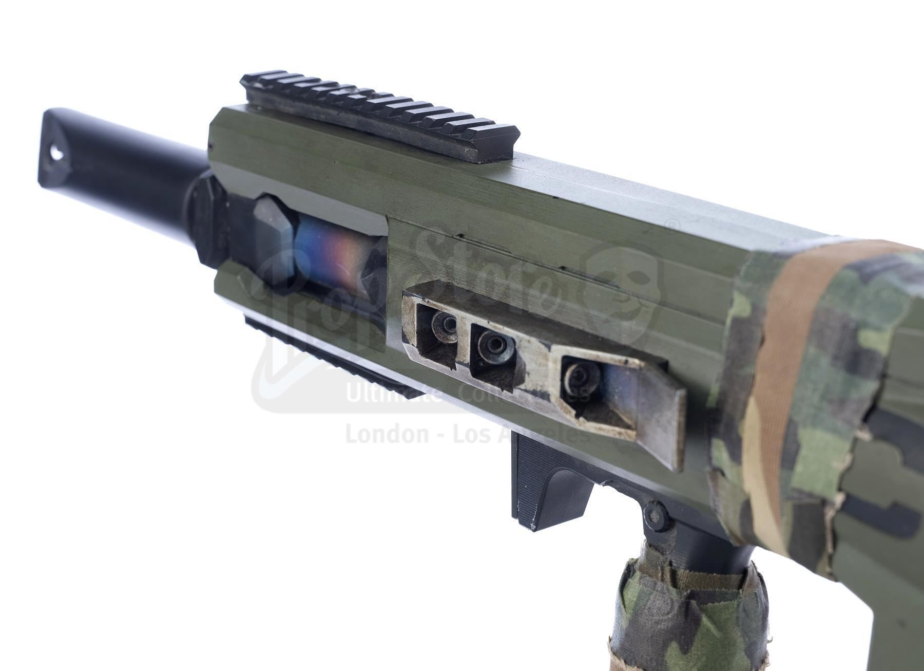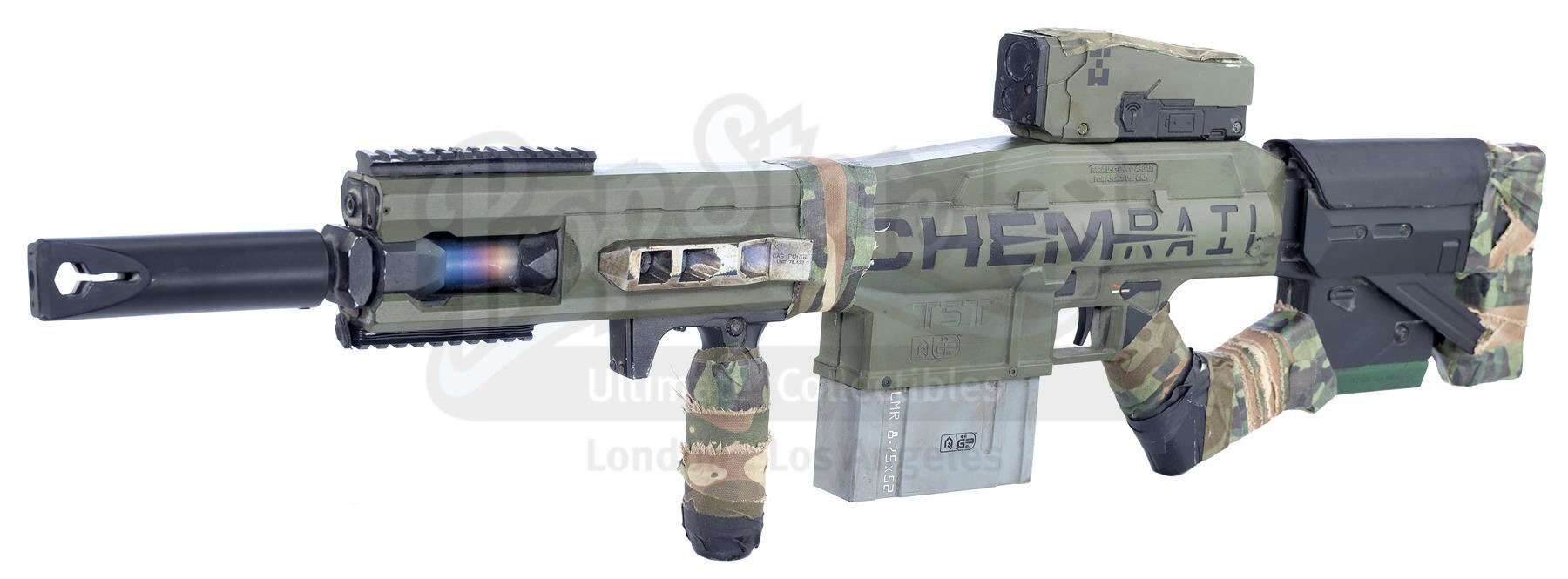 Designed by Weta Workshop, this futuristic rifle consists of a hand-painted black and silvertone fiberglass body with orange, green, and yellow details, a metal ammunition magazine and metallic barrel, and "CHEMRAIL" and "For Asgari Use Only" engraved on the sides. It was built with several practical mechanisms, including an electronic recoil and CO2 gas-emitting mechanism, an illuminating scope screen and an additional light mounted to the prop's frame.
