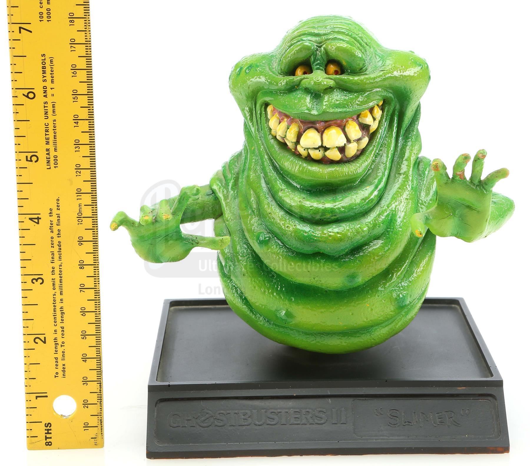 Created by the production's Creature Shop, this cast resin design maquette is painted in Slimer's distinctive vomitous green hue with large white teeth, red gums, yellow eyes with red pupils, and yellow fingernails. The maquette is mounted to a resin base marked "Slimer" with the Ghostbusters II logo. This display is in good overall condition with small chips to the resin around the elbows, fingers, and forehead. Dimensions: 6" x 5 1/2" x 7 1/2" (15.25 cm x 14 cm x 19)