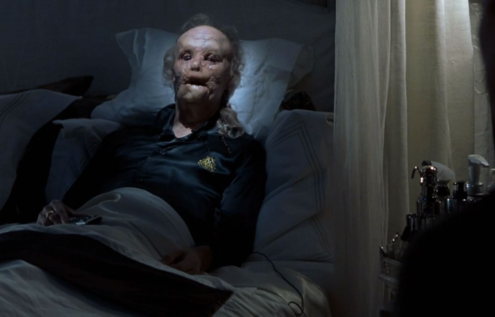 Mason Verger's body double's pajama costume from Ridley Scott's violent thriller Hannibal. Mason wore his pajama costume when he gave Clarice Starling (Julianne Moore) intel on the cannibalistic doctor. The lot is comprised of a pair of pajamas and slippers. The green pajama pants and shirt are both made of silk with Mason's crest embroidered on his left breast. Both the shirt and pants have "OJ" handwritten on sewn-in tags. The black velvet slippers have a bright red inner lining and are a U.S. size 10.