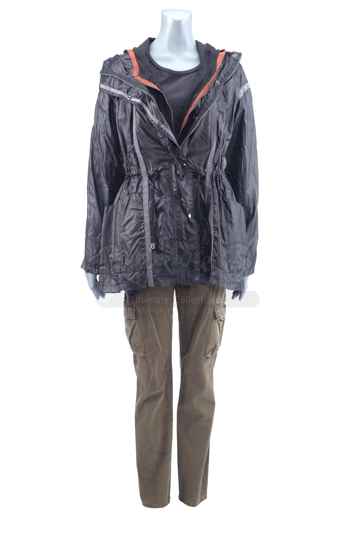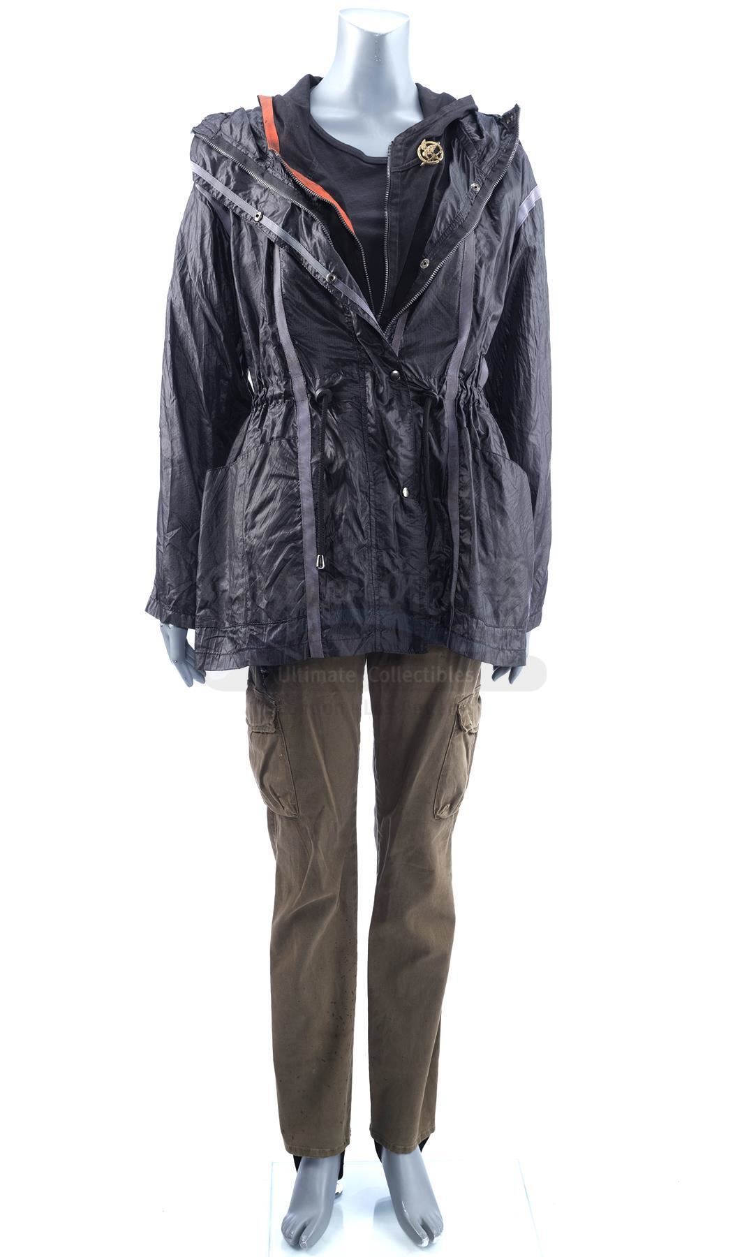 This costume consists of a black cotton zip-up jacket with orange details, a stunt mockingjay pin, and a detachable windbreaker-style accessory, as well as a black cotton shirt, a pair of moss green pants, and a continuity photo featuring the actress wearing the costume on set. Both the jacket and pants have "Katniss" written on their interiors and the jacket features a tag on the neckline interior stating it is "DESIGNED BY JUDIANNA MAKOVSKY", the film's costume designer. The costume is in excellent overall condition with some signs of production wear, including intentional battle-damage throughout the jacket and a large, blood-stained hole on the right pant leg.
