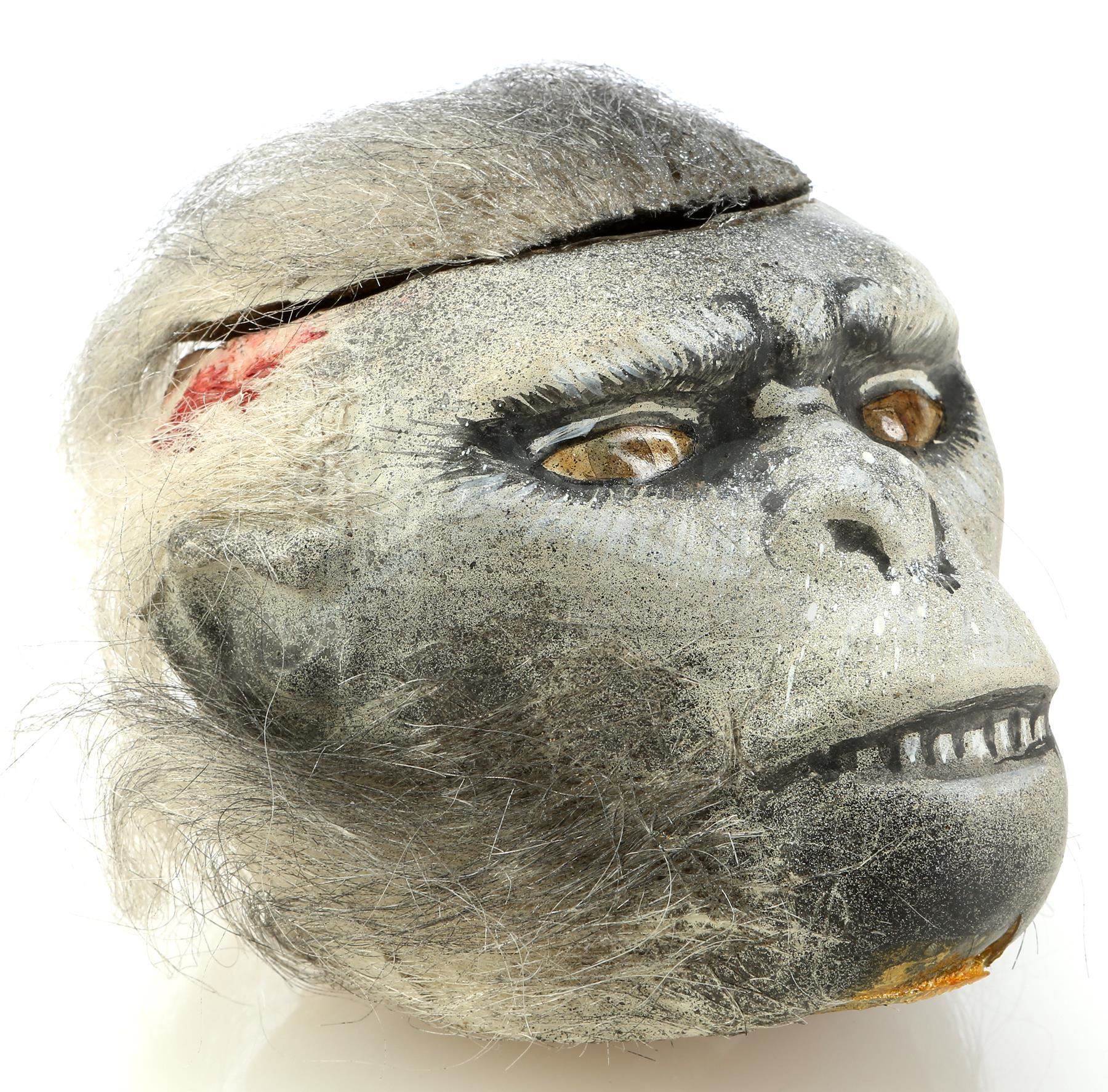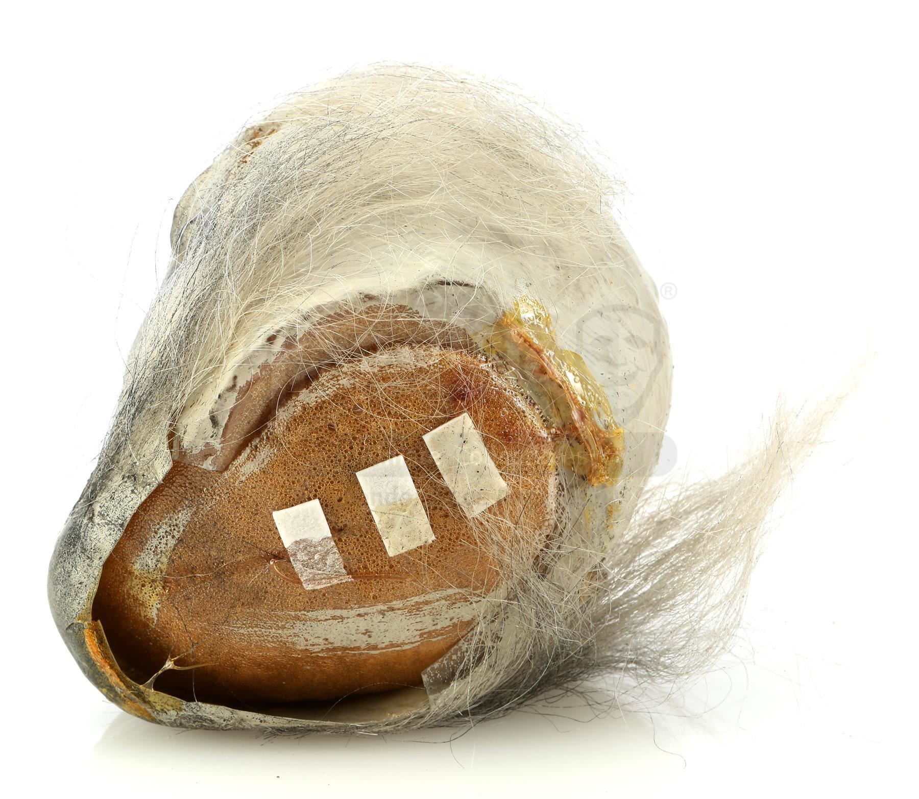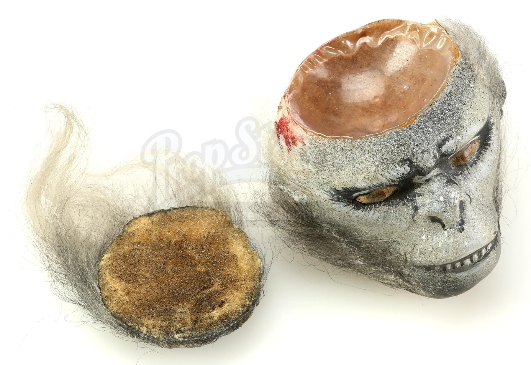 This monkey head is made from a vacuformed plastic shell filled with biscuit foam hand-painted with eye, nose, and teeth detailing and applied with gray hair. The top piece of the head is removable and reveals a small plastic bowl where the "brains" were served. The head features some signs of production wear and age, including red stains from the food coloring used on the props, but it remains in good overall condition. Dimensions: 6" x 4 1/2" x 5" (15 cm x 13 cm x 4 cm)
