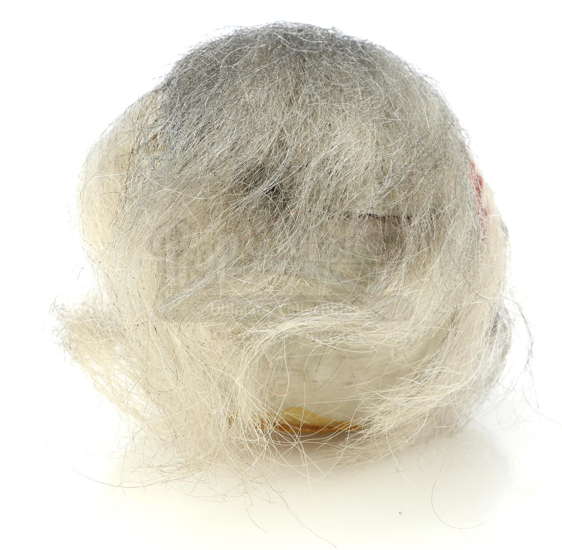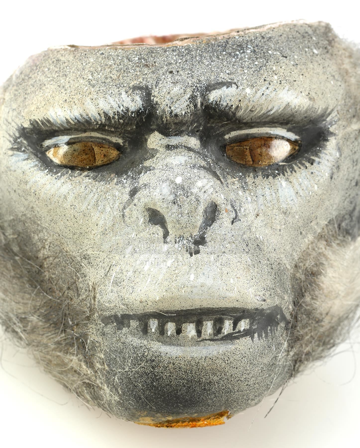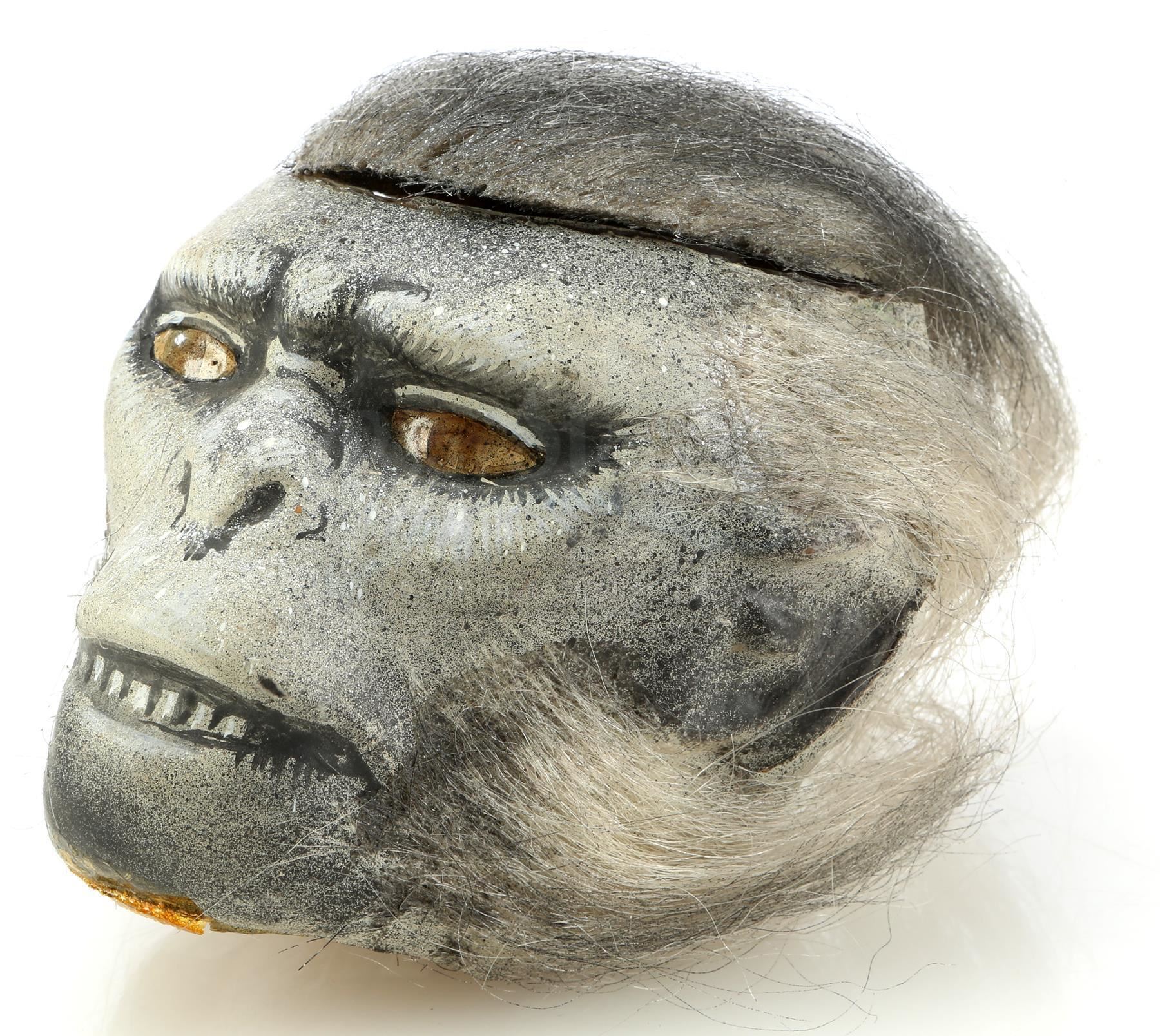 This monkey head is made from a vacuformed plastic shell filled with biscuit foam hand-painted with eye, nose, and teeth detailing and applied with gray hair. The top piece of the head is removable and reveals a small plastic bowl where the "brains" were served. The head features some signs of production wear and age, including red stains from the food coloring used on the props, but it remains in good overall condition. Dimensions: 6" x 4 1/2" x 5" (15 cm x 13 cm x 4 cm)