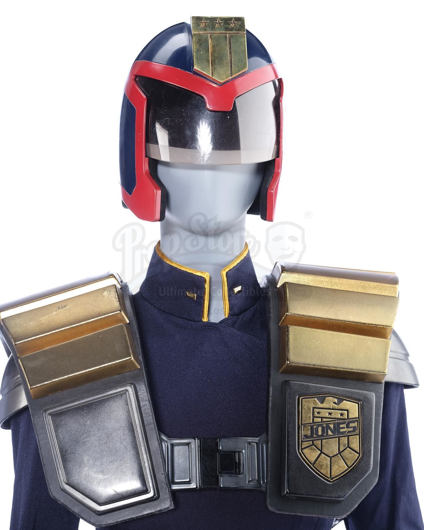 It consists of a navy polyester blend bodysuit; a navy polyester zip-up jacket with yellow details on the collar and a pair of metal buckles; a black rubber and Velcro belt with five rubber false pouches; a pair of black foam rubber wrist guards with goldtone adjustable clasps; a pair of black leather gloves with foam rubber and resin black and goldtone details; a pair of black foam rubber knee pads with a pair of clasped straps and a foam interior; a pair of black rubber and leather boots; a gray and goldtone vacuform plastic, rubber and fiberglass piece of shoulder armour with a "JONES" badge at the left shoulder; and the navy, red, and gold fiberglass judge helmet with a tinted plastic visor. It is in good overall condition with wear from production throughout, including extensive wear and degrading on the boots, some staining on the jacket, and broken clasps on the right knee pad.
