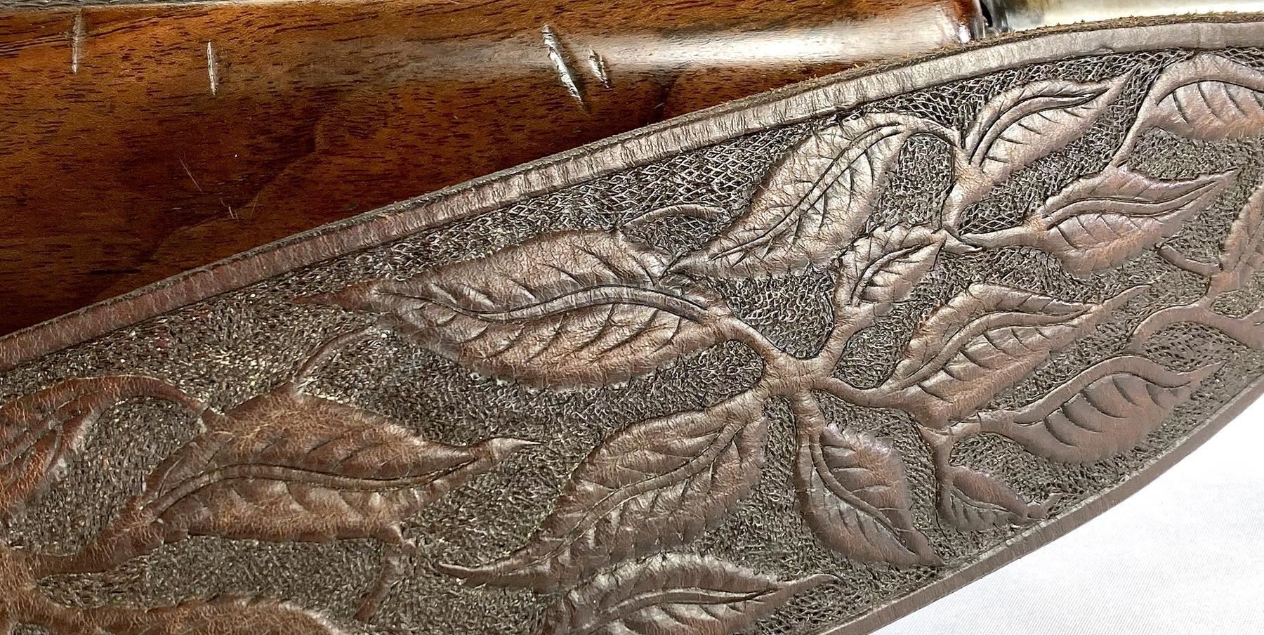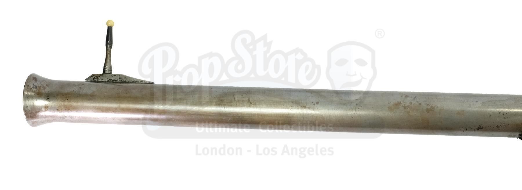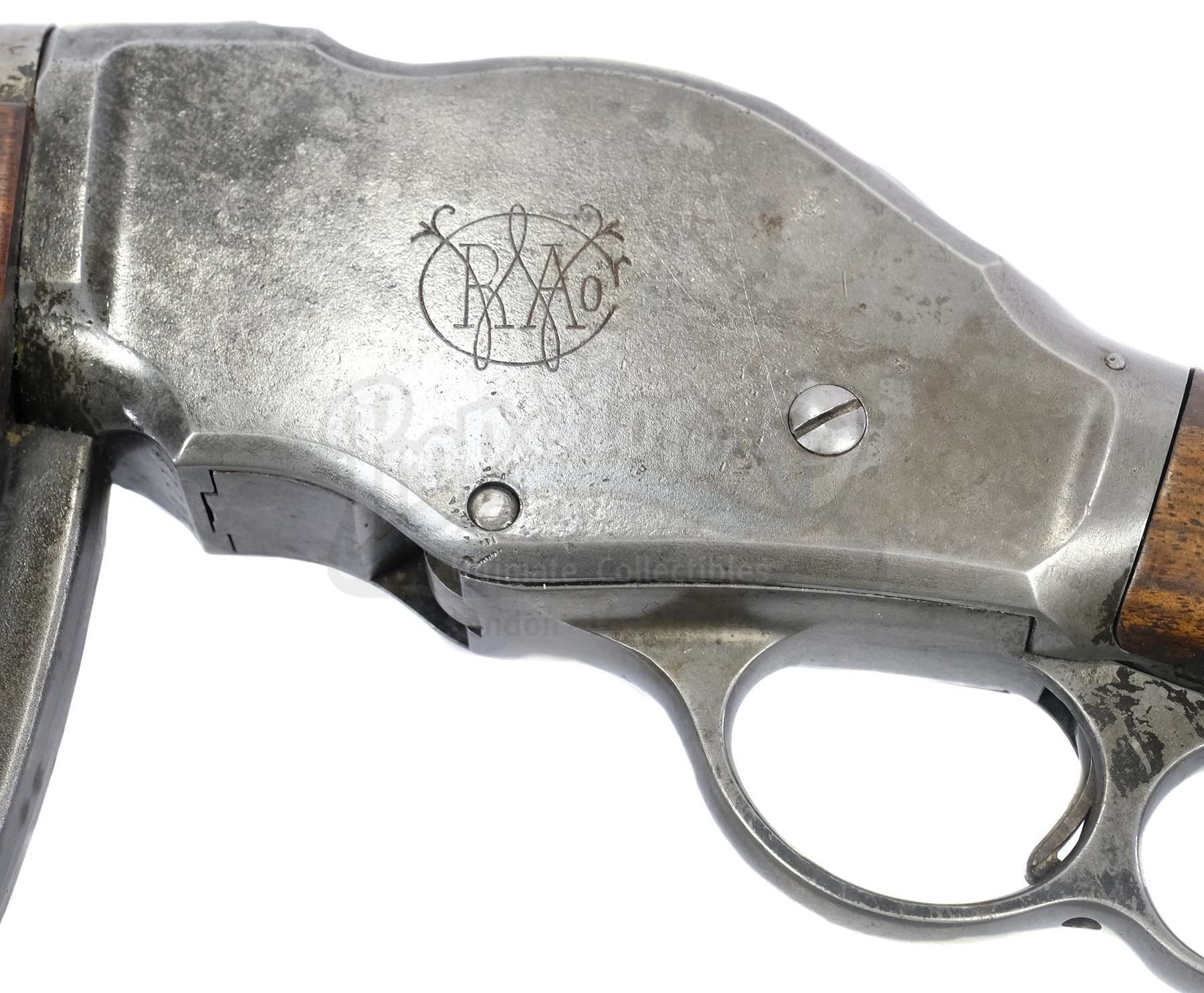 This carved, custom-made dark brown wood and metal rifle, the only one made for production, is a modified Winchester M1901 shotgun with a custom stock, metal sights, a mahogany leather shoulder strap with an embossed floral pattern, a prop box magazine, and a large barrel cover to give it the appearance of an elephant gun. It is in good overall condition with some signs of wear from production use and handling, including scuffing throughout and extensive intentional weathering to appear aged and used. The rifle is currently stored in Canada and will need to transfer to the winner through a licensed firearms dealer.