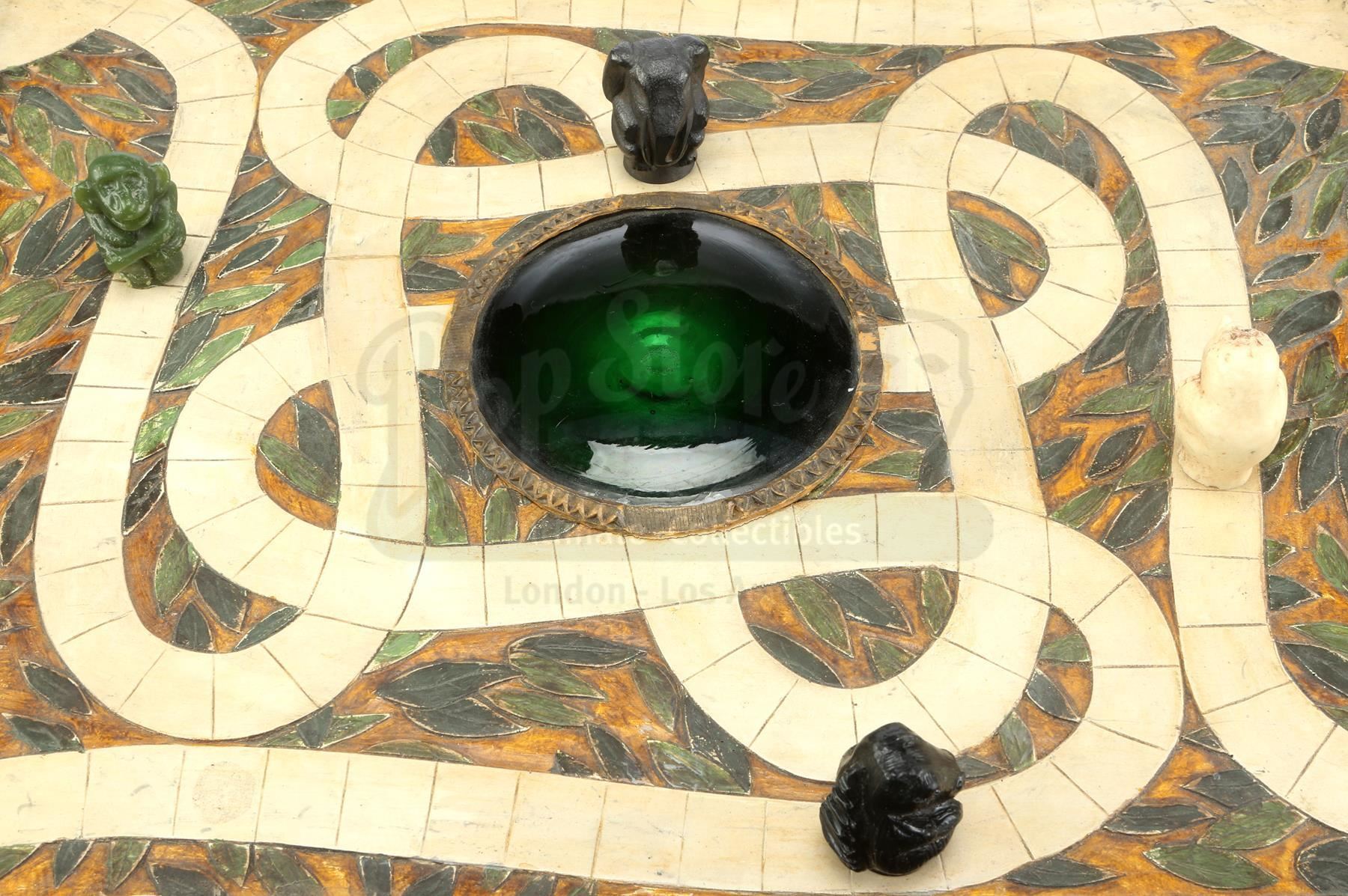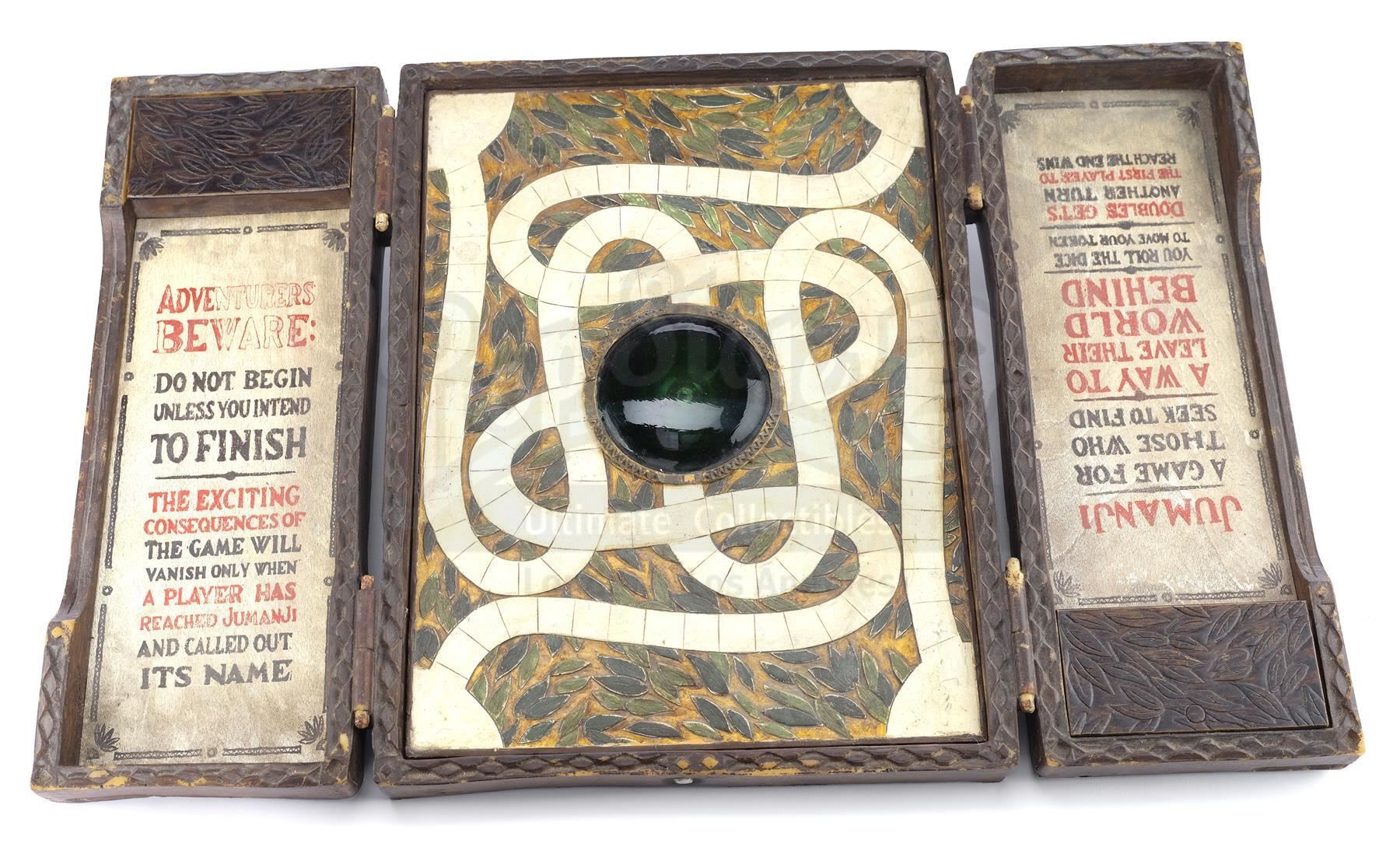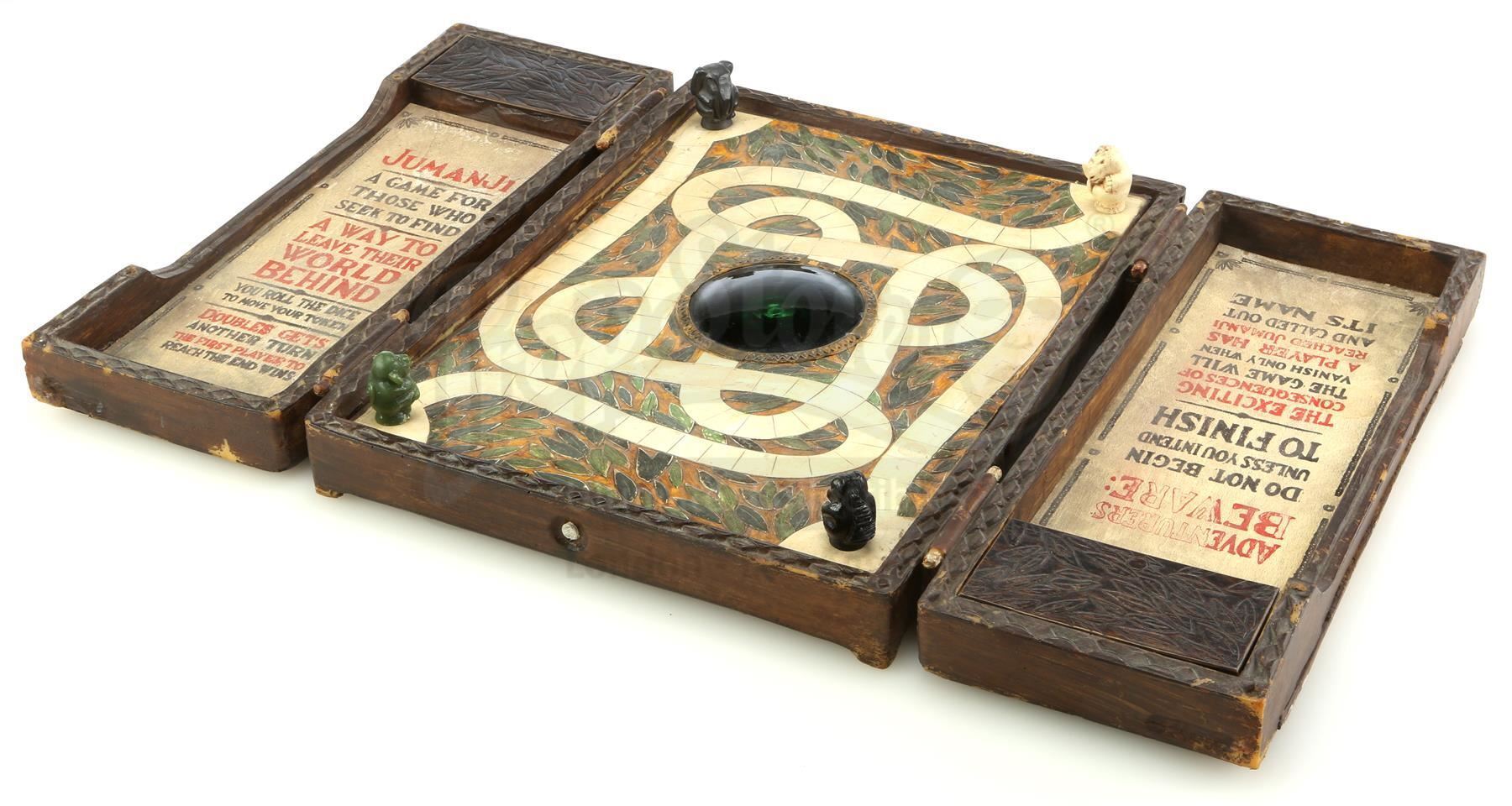 A screen-matched Jumanji game board from Joe Johnston's family adventure film Jumanji. Shoemaking heir Alan Parrish (Robin Williams) was sucked into the magical survivalist board game Jumanji and later freed by Peter Shepherd (Bradley Pierce), only to be forced to continue playing his game from 26 years before.