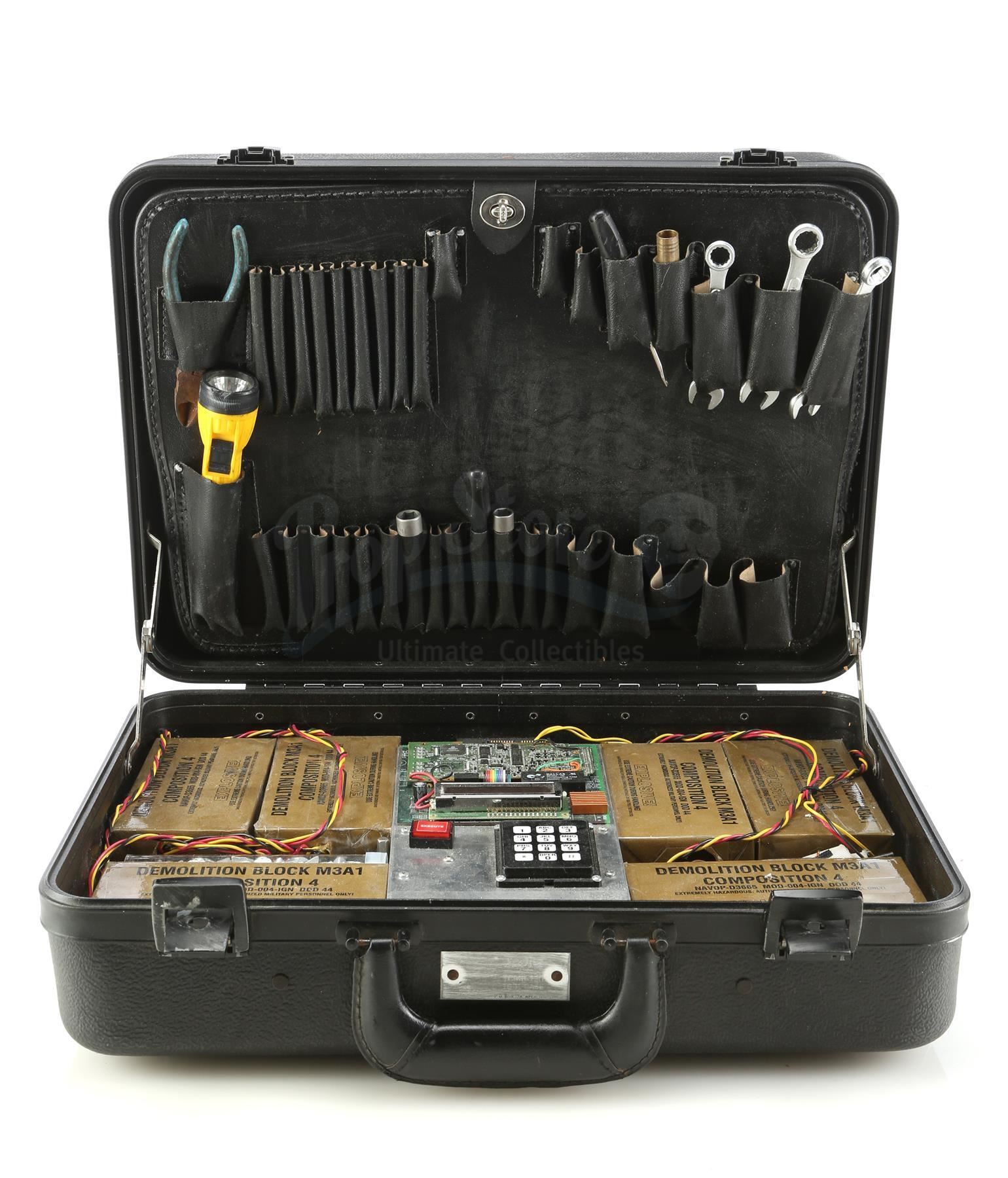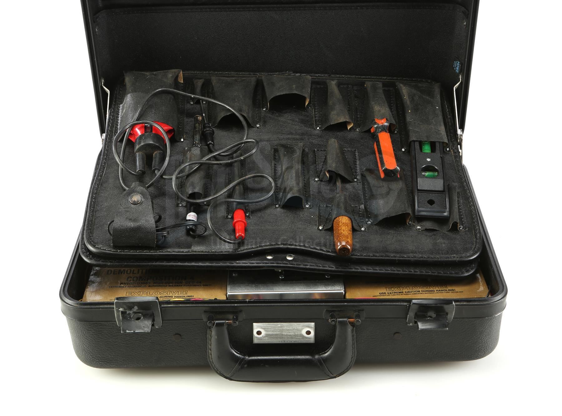 This lot includes a charcoal-color suitcase with metal latches and a hard plastic shell containing six blocks of prop C-4, multiple tools including a flashlight and several wrenches, a fabric strip reading "NOT YET," and a metal prop detonation device with a button labeled "execute" connected with wires to tubes of prop chemicals. When compressed, the button illuminates.