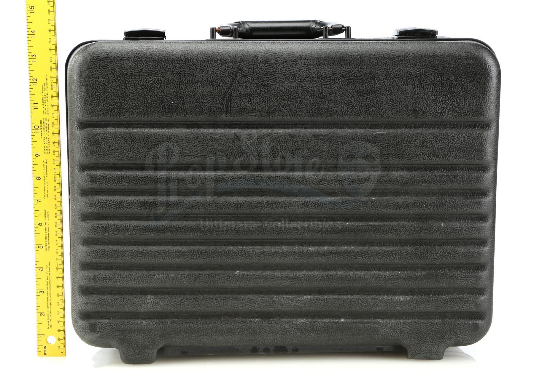 This suitcase bomb prop is in good overall condition with one of the C-4 blocks loose from its adhesive and various signs of wear throughout from production. Dimensions: 13" x 18" x 7" (33 cm x 45.75 cm x 18 cm)
