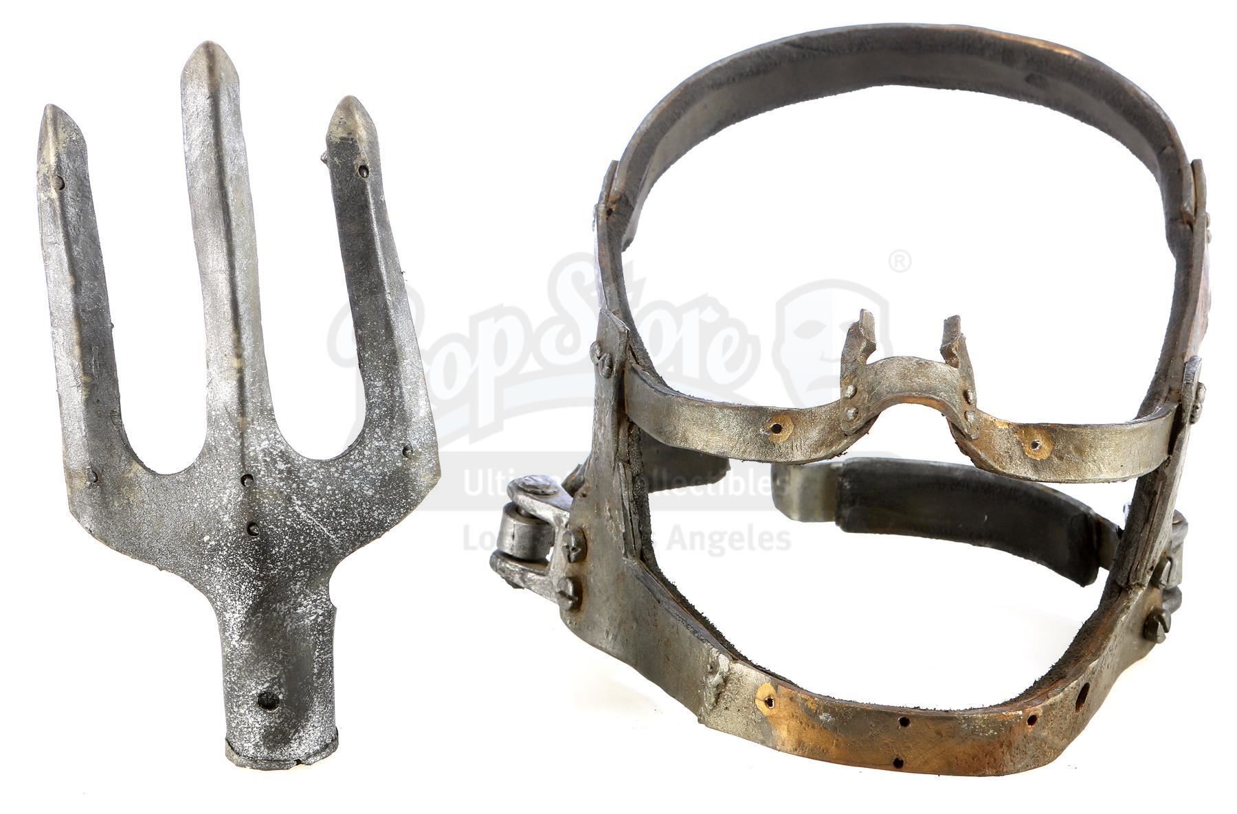 This stunt muzzle consists of several pieces of resin which have been connected and shaped to form a facial appliance, including a pitchfork-like piece in the front to cover the mouth and pieces that fit around the back of the head and neck. Several of the pieces feature padding on the interior for the wearer and the rear neck pieces swivel open for ease of wear. This muzzle is in good overall condition with some signs of wear from production and a missing lock loop on one of the rear neck pieces.