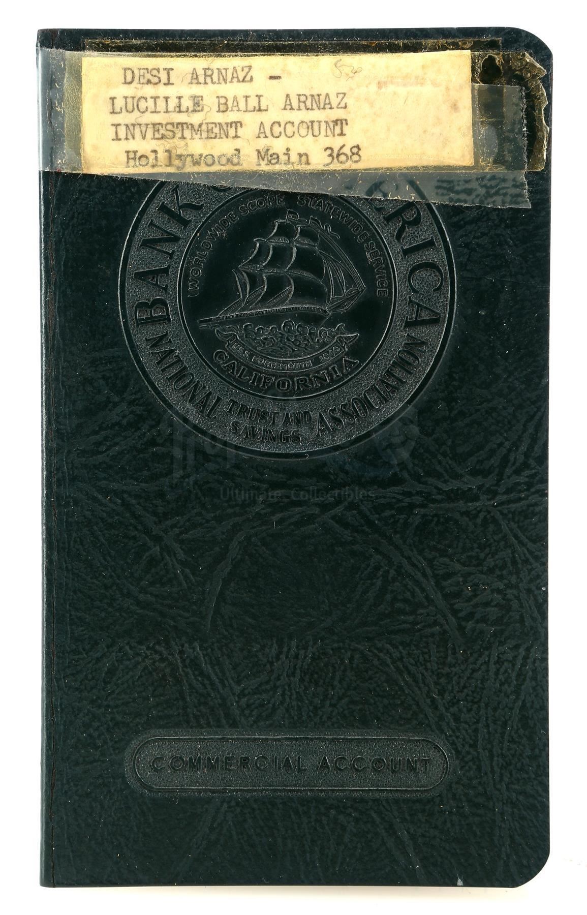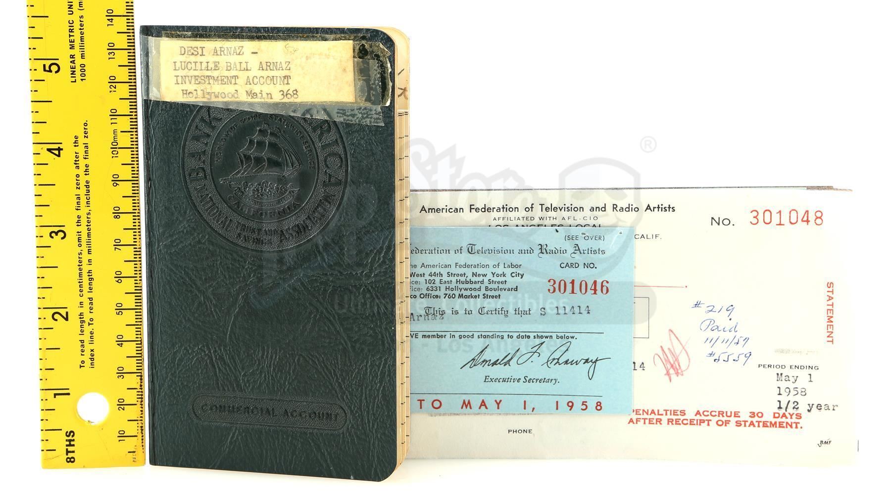 This lot consists of a navy blue leatherette-bound bank book noted as belonging to "DESI ARNAZ" with handwritten and stamped financial records dated between 1955 and 1956, a receipt from the American Federation of Television and Radio Artists dated May 1, 1958, and four receipts dated between 1957 and 1958 to the Screen Directors Guild of America as well as Arnaz's paper membership card for the guild dated from 1956 to 1957. These receipts, card, and book are in excellent overall condition with minor signs of age and two more small holes punched on the upper corner of the SDGA card. Dimensions: (largest) 8 3/4" x 3 1/2" (22.25 cm x 9 cm); (smallest) 3 3/4" x 2 1/2" (9.5 cm x 6.25 cm)