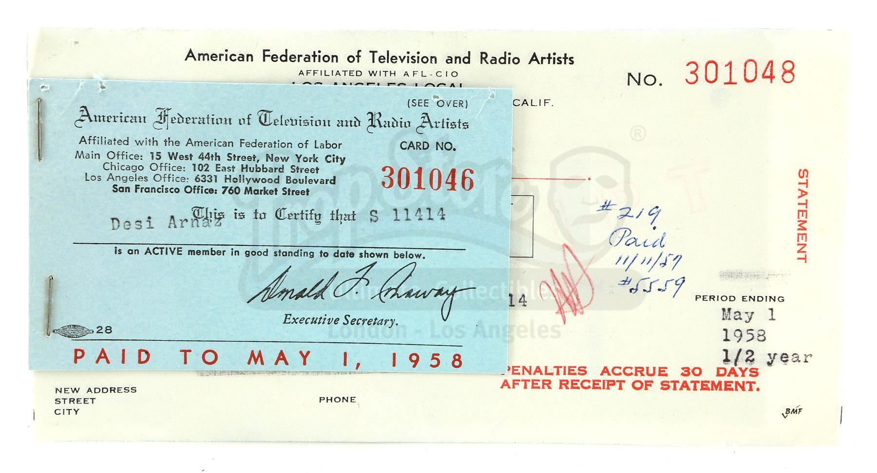Desi Arnaz's SDGA receipts and card, AFTRA receipts and bank book. Best known as Ricky Ricardo on the 1950s television comedy I Love Lucy, Arnaz was involved in many productions as a performer, producer, and director.