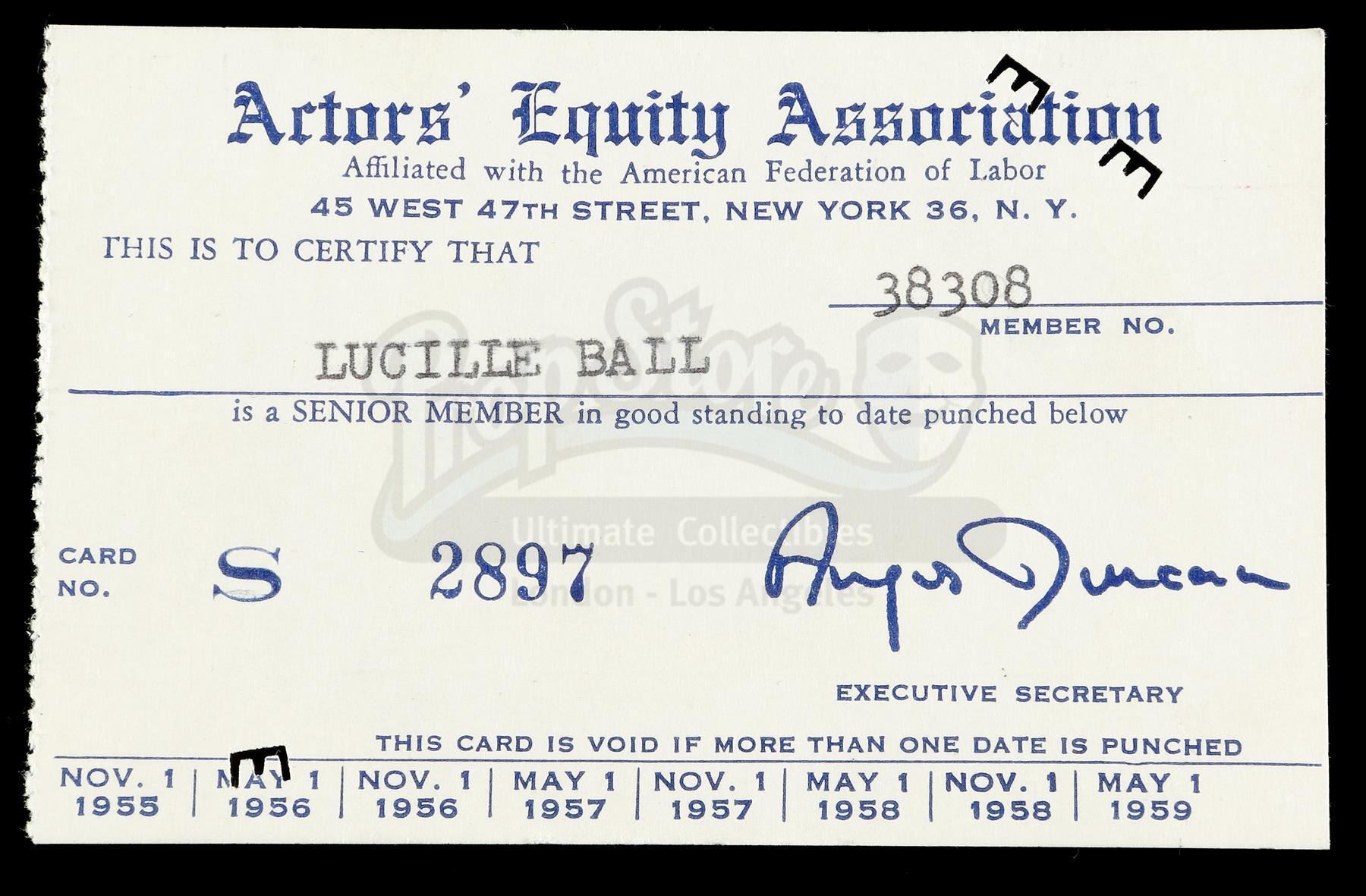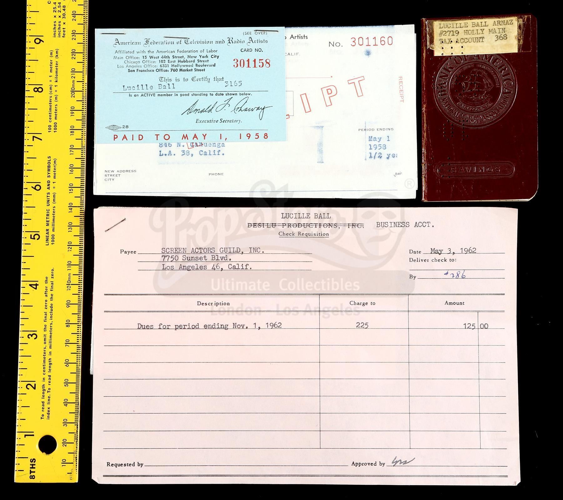 A collection of Lucille Ball's personal paperwork from the era of her classic television series sitcoms I Love Lucy and The Lucy Show. Included in the collection are Ball's 1956 Actor's Equity Association card, her 1962 Screen Actors Guild card, a burgundy leather-bound bank book inscribed "LUCILLE BALL ARNAZ," and three paper receipts from various performers unions. These pieces are in excellent overall condition with only minor creases and wear along the edges. Dimensions: (largest) 8 1/2" x 5 1/2" (21.5 cm x 14 cm); (smallest) 3 1/2" x 2 1/2" (9 cm x 6.25 cm )