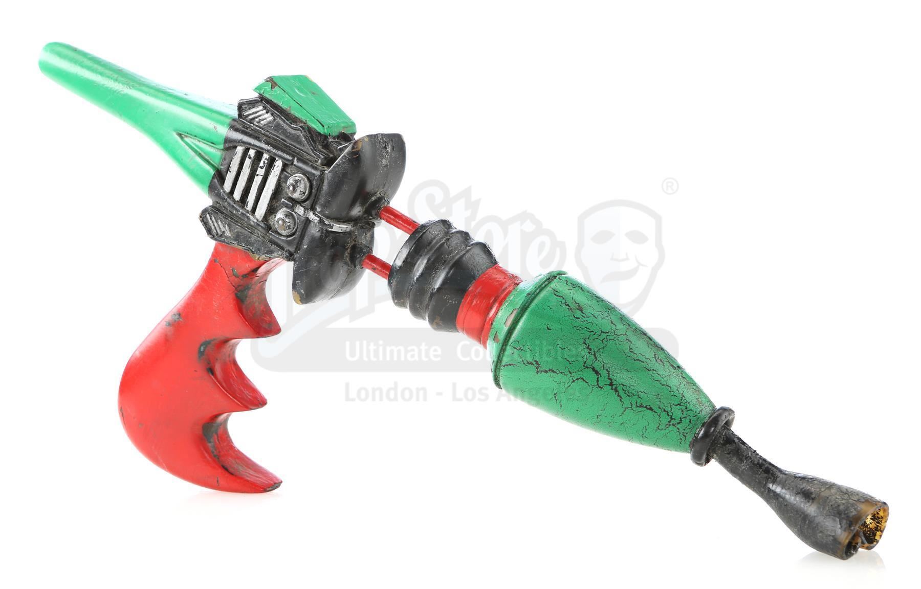 This otherworldly blaster is made of dense, molded rubber painted red, green, grey, and silvertone.
