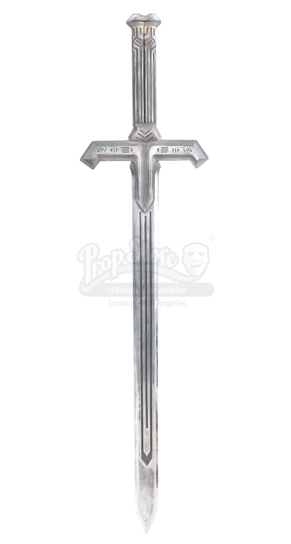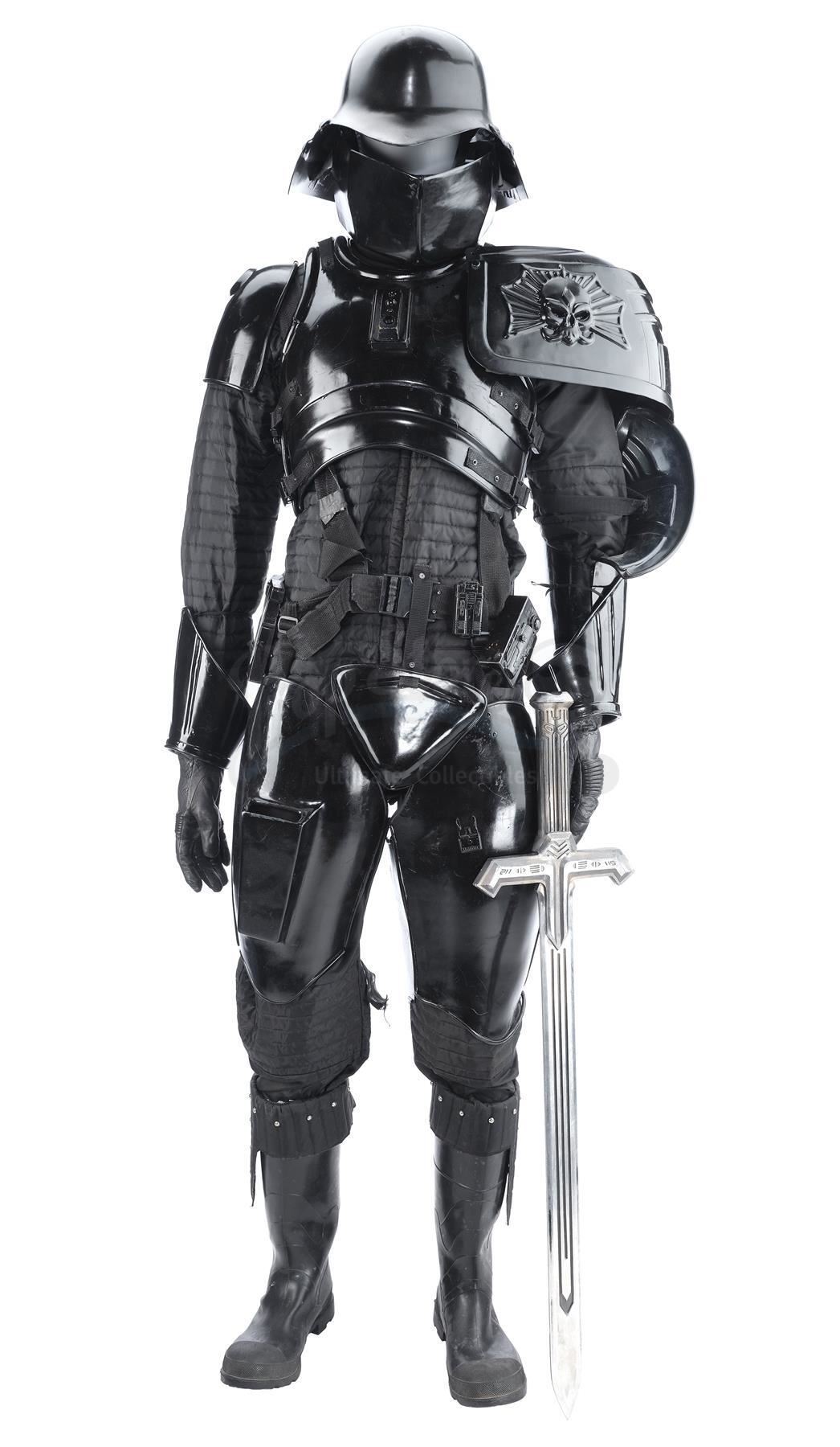 This costume consists of black vacuum-formed plastic armor including a helmet; face guard; chest armor with one small right shoulder plate attached; back armor; one large left shoulder plate with a skull motif; one elbow guard; two wrist guards; a codpiece; a rear plate; thigh armor; a black padded, fabric blend jumpsuit; matching black neckpiece; black leather gloves; a black nylon utility belt with various resin attachments, and a pair of black rubber boots with metal studded black fabric blend overlays. In the center of the chestpiece are four small lights wired to a battery pack hidden inside the armor. The sword features a silvertone metal blade and a molded resin hilt painted gray and decorated with various small symbols. The lot is in good overall condition with some wear from production and age, including scuffing to the armor and some paint chipping on the sword. Dimensions (sword): 24" x 9" x 3" (61 cm x 23 cm x 7.75 cm)