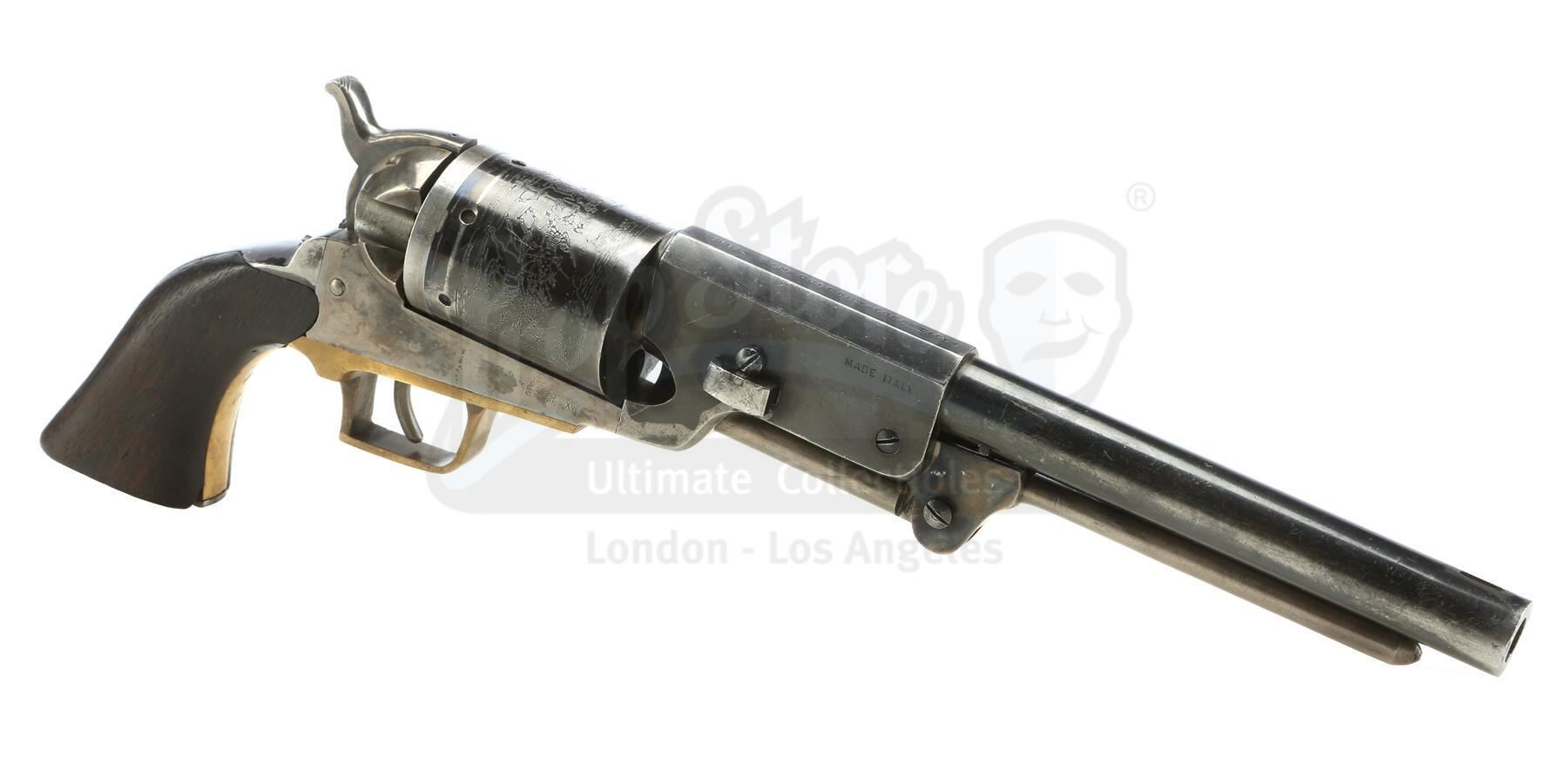 A screen-matched, blank-firing, hero Colt Walker-style revolver from Clint Eastwood's revenge Western The Outlaw Josey Wales. Wales (Eastwood) carried his signature dual Colt Army Model Whitneyville Walker revolvers with him throughout the film as he hunted the men who killed his family. This modern version, converted to fire blanks, was used during the dramatic farmhouse shootout sequence with Terrill (Bill McKinney) at the end of the film, with patterns and marks above the trigger area screen-matched to the one fired onscreen.