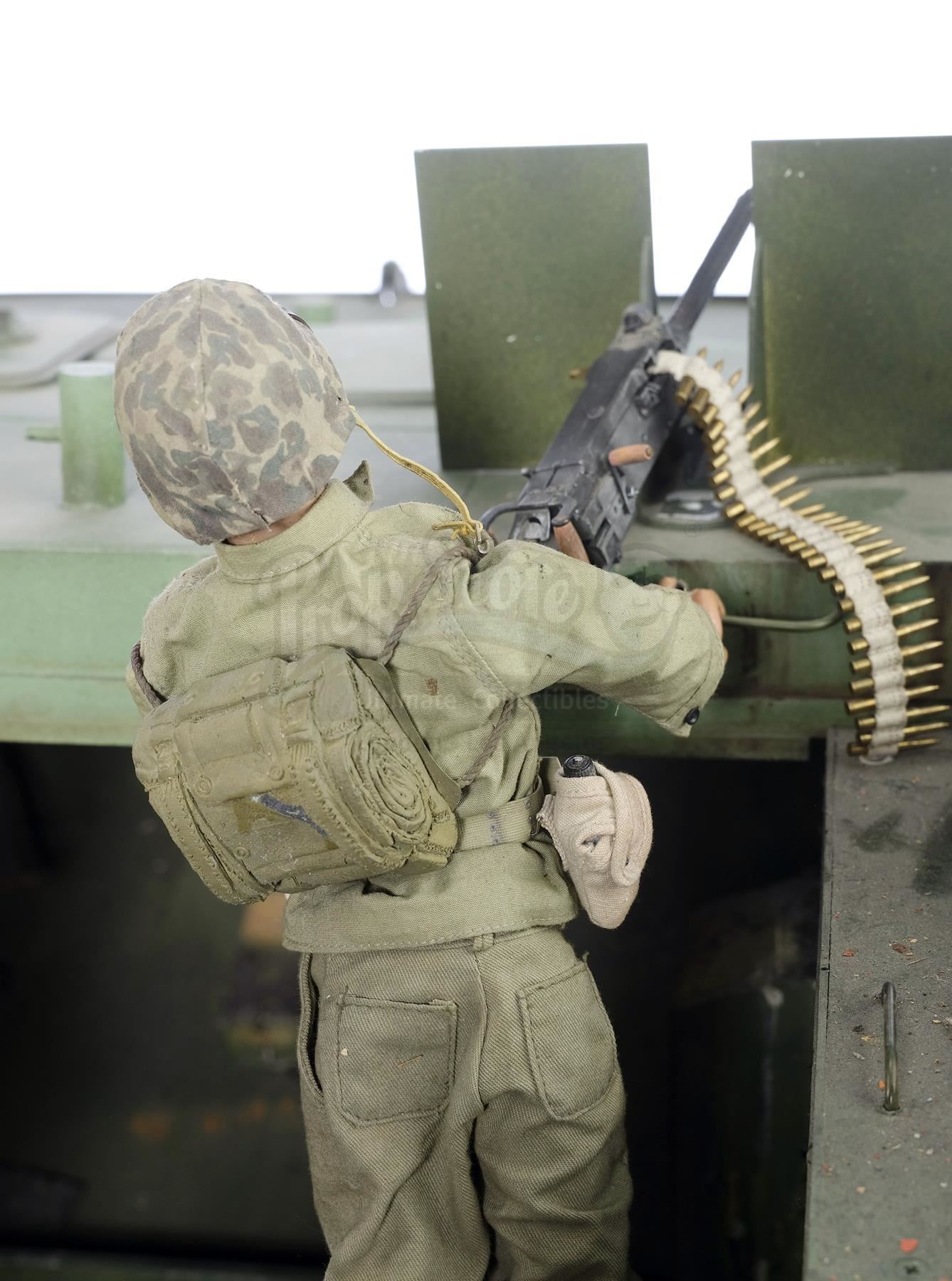 The model is constructed of hand-painted fiberglass with metallic accessories and weaponry, rubber tracks, six original plastic and cloth poseable soldiers made from off-the-shelf toys with wardrobe and accessories added by production, and 14 small metal stands for stabilizing the figures. The model is in excellent overall condition with minor scuffs throughout and the tracks missing from the bottom.