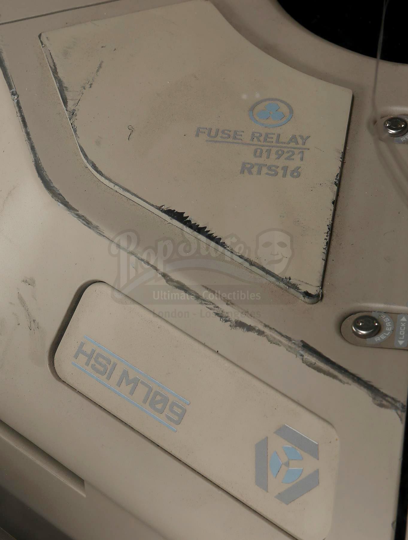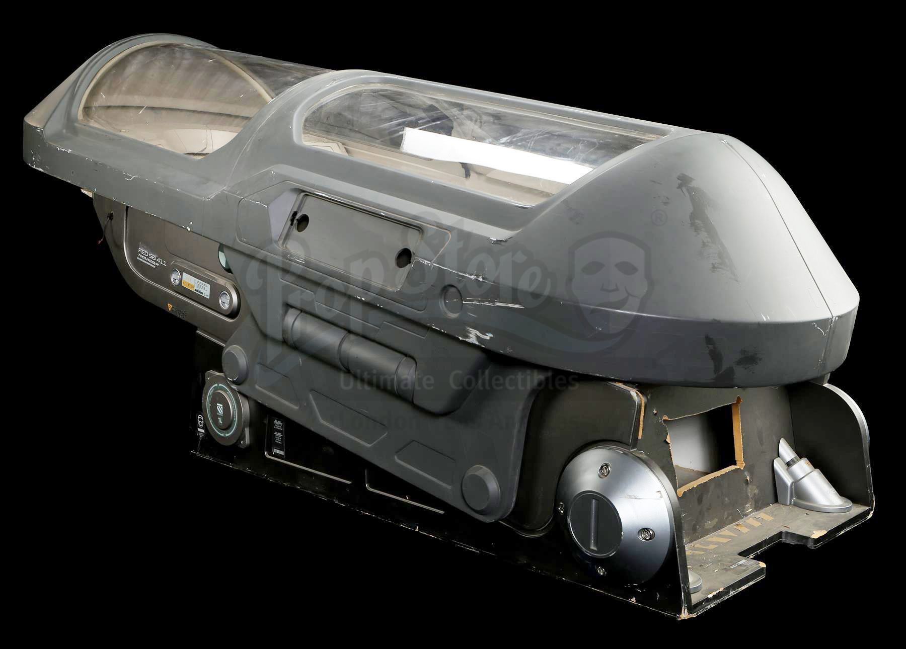 This lot was originally constructed by production as a hibernation pod, then updated and repainted for a separate production, where it ultimately went unused. It consists of a clear silicone-padded medical bed set into a resin-detailed, domed fiberglass and metal frame with clear thermoplastic windows, all mounted to a black, yellow, and silver-painted wood and steel paneled base. Stenciled text and decals featuring code numbers are applied to the interior and exterior, and loose wiring protrudes from the frame.