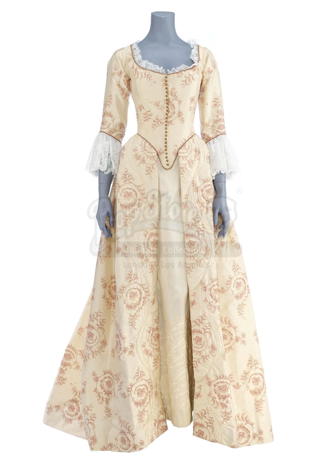 The lot consists of a dress and a petticoat. The peach-color dress features a floral vine pattern throughout with lace-trimmed sleeves and neckline. The petticoat is made of goldtone silk and features a decorative stitched hem. Both include a handwritten tag sewn into the piece, with the dress reading "Keira Knightley" and the petticoat tag reading "Kiera [sic] Knightley." Accompanying the costume is a wardrobe tag from production, with one side reading "Elizabeth Hero" and the other listing the change number and full costume components. The lot remains in excellent overall condition.