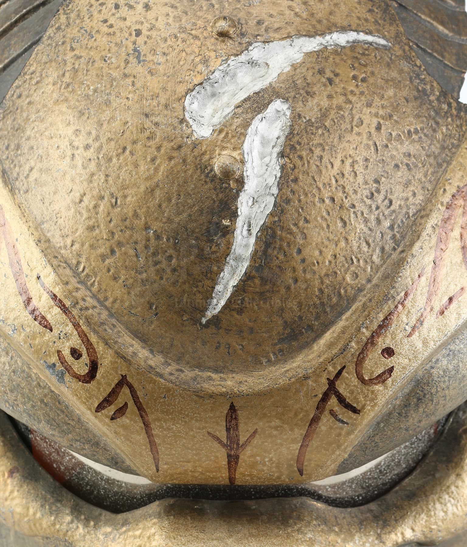 This horned fiberglass helmet was designed, fabricated, and painted goldtone with brown symbols by Academy Award-winning special effects group Amalgamated Dynamics, Inc. (ADI) to appear weathered from age and battle. It features stylized resin horns on top, a tri-laser slot on the right side, beaded leather hunting straps affixed across the brow and jaw, and a silvertone paint marking on the forehead meant to appear burnt by xenomorph blood. The textured black interior is marked "MIREK", and affixed with a hanging wire and a one-way mirror visor secured with putty and gaffer's tape.