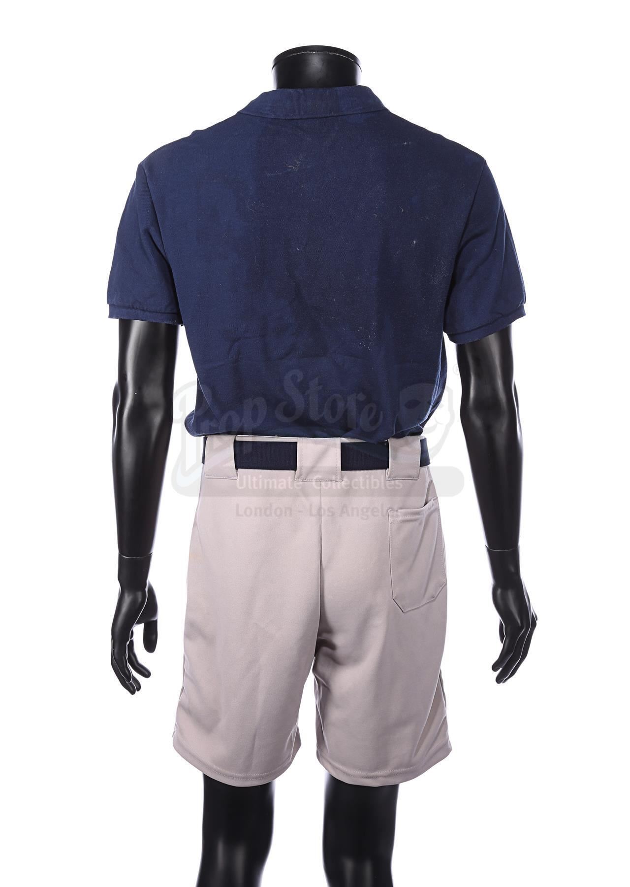 The costume consists of a navy and yellow Stedman polo shirt (size Adult M), a pair of beige Teamwork Athletic polyester shorts (L 36-38), and a blue elastic blend belt. It exhibits some signs of production use, including several colored cake stains and a strong residual odor.