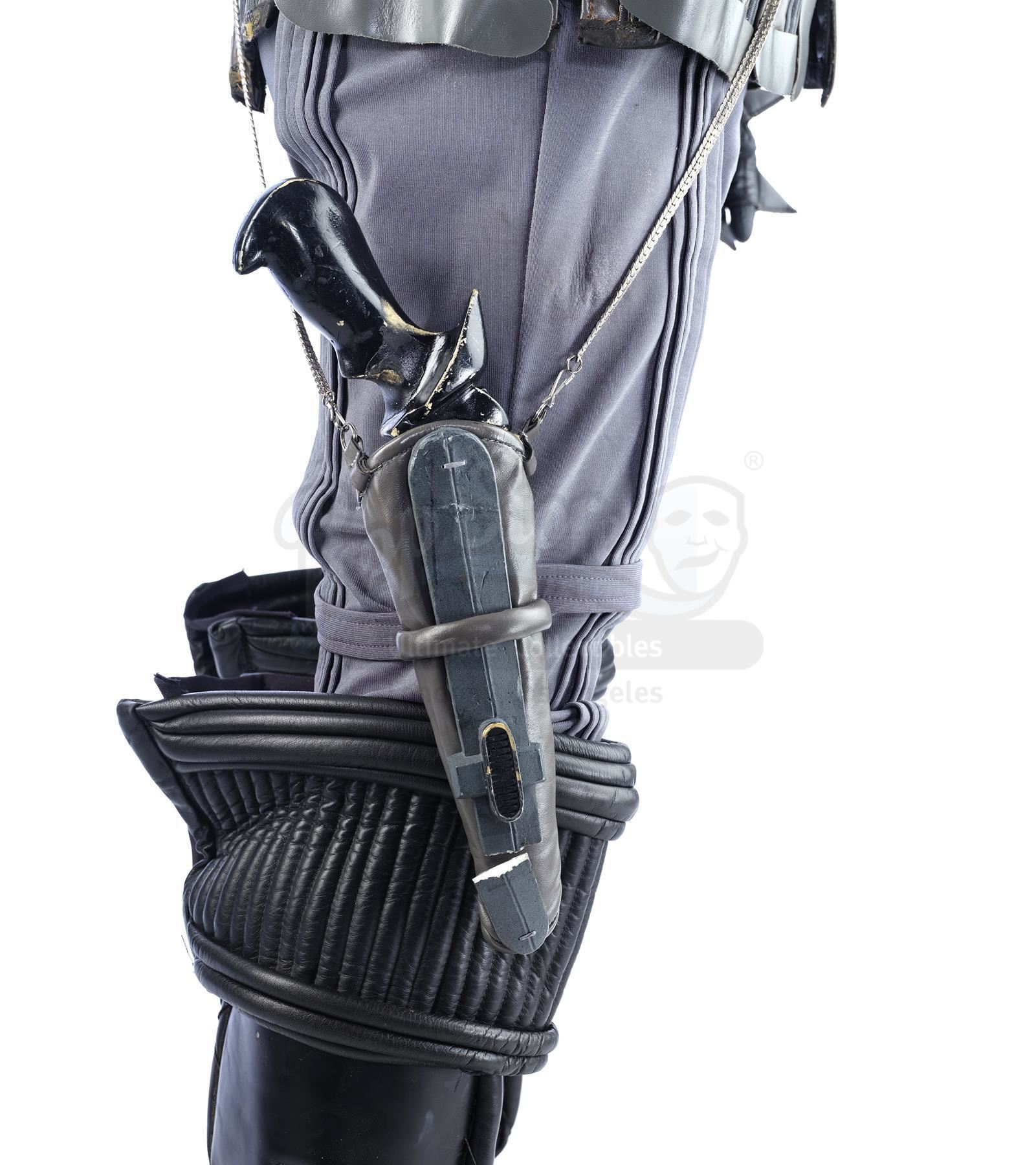 The costume consists of a black zip-front cotton-blend undershirt with black faux fur sleeves with two gray-painted resin Klingon badges on the left sleeve; a black leatherette collar piece with rubber piping and gray-painted resin embellishments; a gray leatherette tunic with plastic, rubber, and metal detailing; a detachable gray foam-rubber spine to hide the tunic's zipper; a black and brown foam rubber baldric; a resin disruptor inside a gray leatherette holster hanging from a metal chain; a pair of black leatherette gauntlets with rubber rings; a pair of fingerless black leatherette gloves with soft knuckle spikes; a black leather belt with a gray painted resin buckle; a pair of gray Spandex-blend pants with ribbed vertical piping and shoe stirrups; a pair of black leatherette knee-high boots with gray accents and soft leatherette spikes; and a foam latex headpiece with a ridged forehead painted in dark red-brown flesh tones and thick black hair adhered to the eyebrows and scalp. Throughout the various components of the costume are several Paramount Parks wardrobe tags hand-labeled for "Zachary H." The lot is in fair overall condition with wear from use and age, including deterioration to the foam rubber and latex, several broken resin elements, and loose or missing pieces throughout.