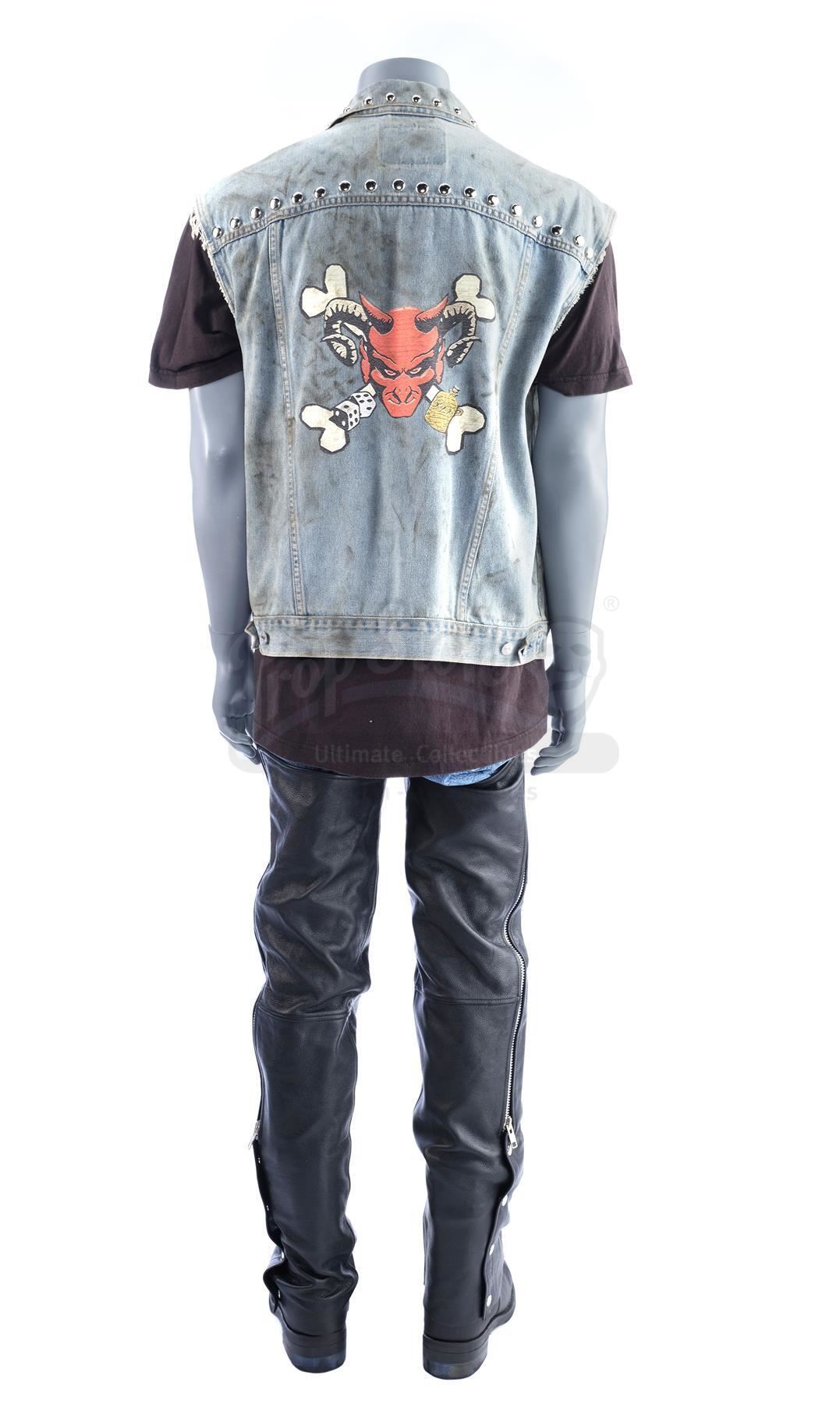 This costume consists of a black leather zip-up Wilson's Leather jacket (size L) with matching chaps, a blue Levi Strauss & Co. sleeveless jean jacket (size L) with a devil logo on the reverse, a black cotton Champs T-shirt (size L) with a skull-and-crossbones logo, a pair of black leather gloves (size L), a pair of blue Levi Strauss & Co. jeans (30x30), and a pair of black leather and rubber Durango belted boots. The costume exhibits intentional distressing by production, including stains, small tears to the fabric, and creased leather, but it remains in good overall condition.