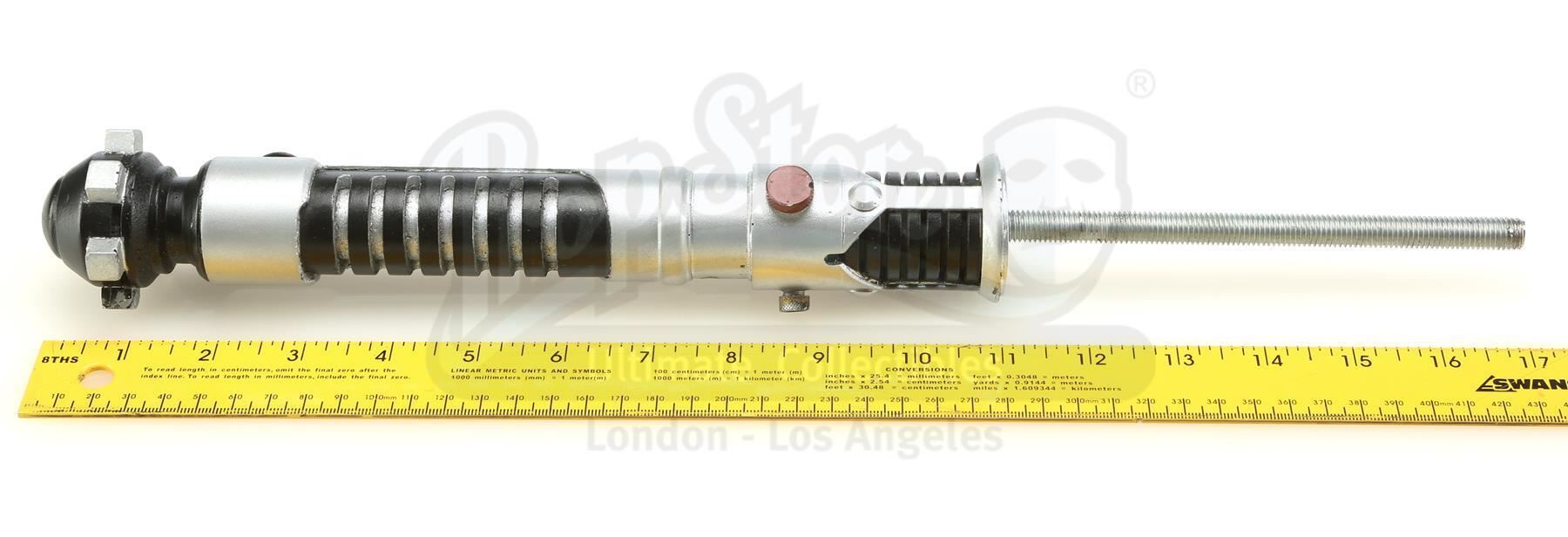 This lightsaber hilt features a ridged resin and metal handgrip with a rounded pommel cap inset with a threaded rod and painted silvertone, goldtone, black, and red to simulate a metallic finish. The threaded rod allowed for installation of aluminum blades that were used for dueling sequences and replaced frequently as they were damaged on set. The hilt is in excellent overall condition with minor cracks in the resin and small scuffs throughout from handling. Dimensions: 2" x 2" x 17 1/2" (5 cm x 5 cm x 44.5 cm)