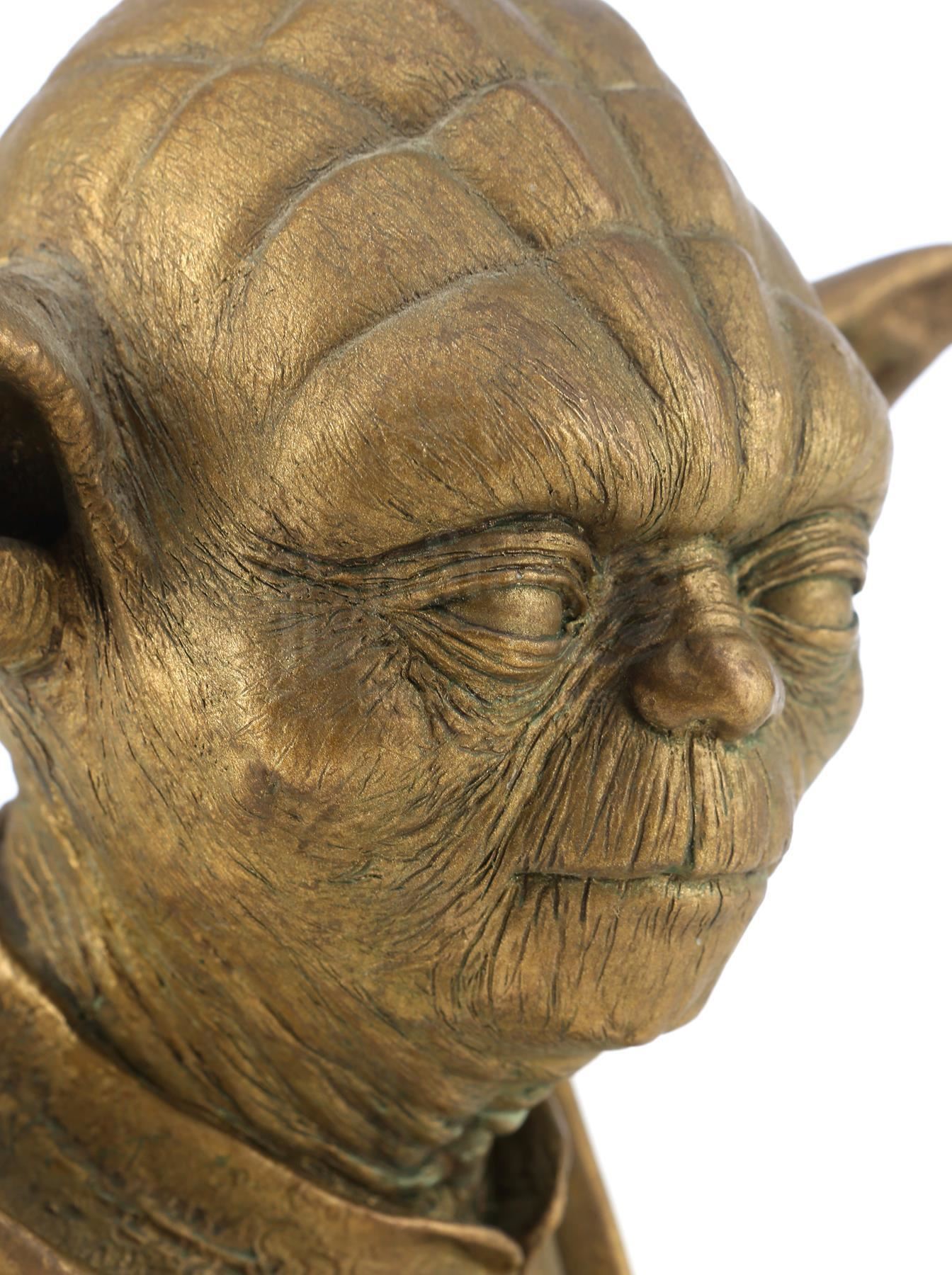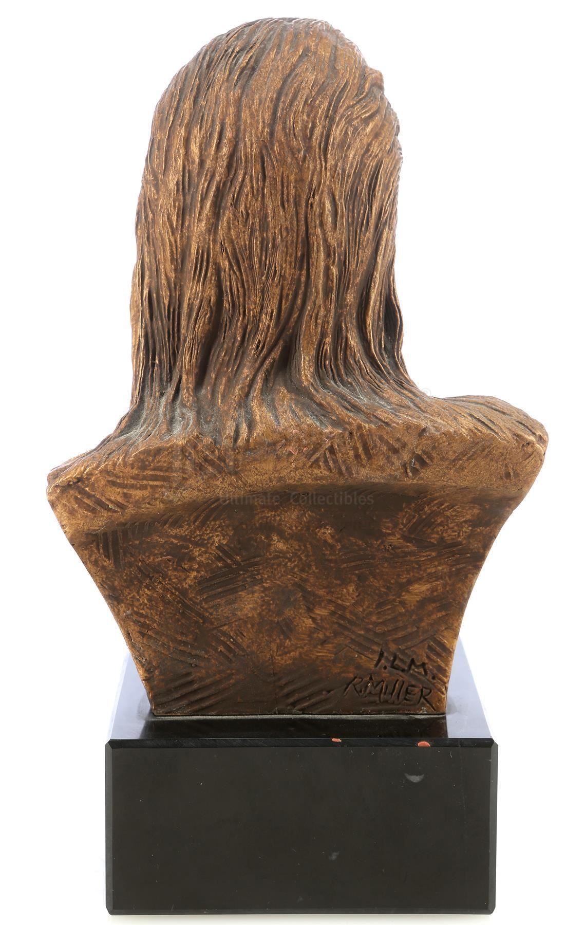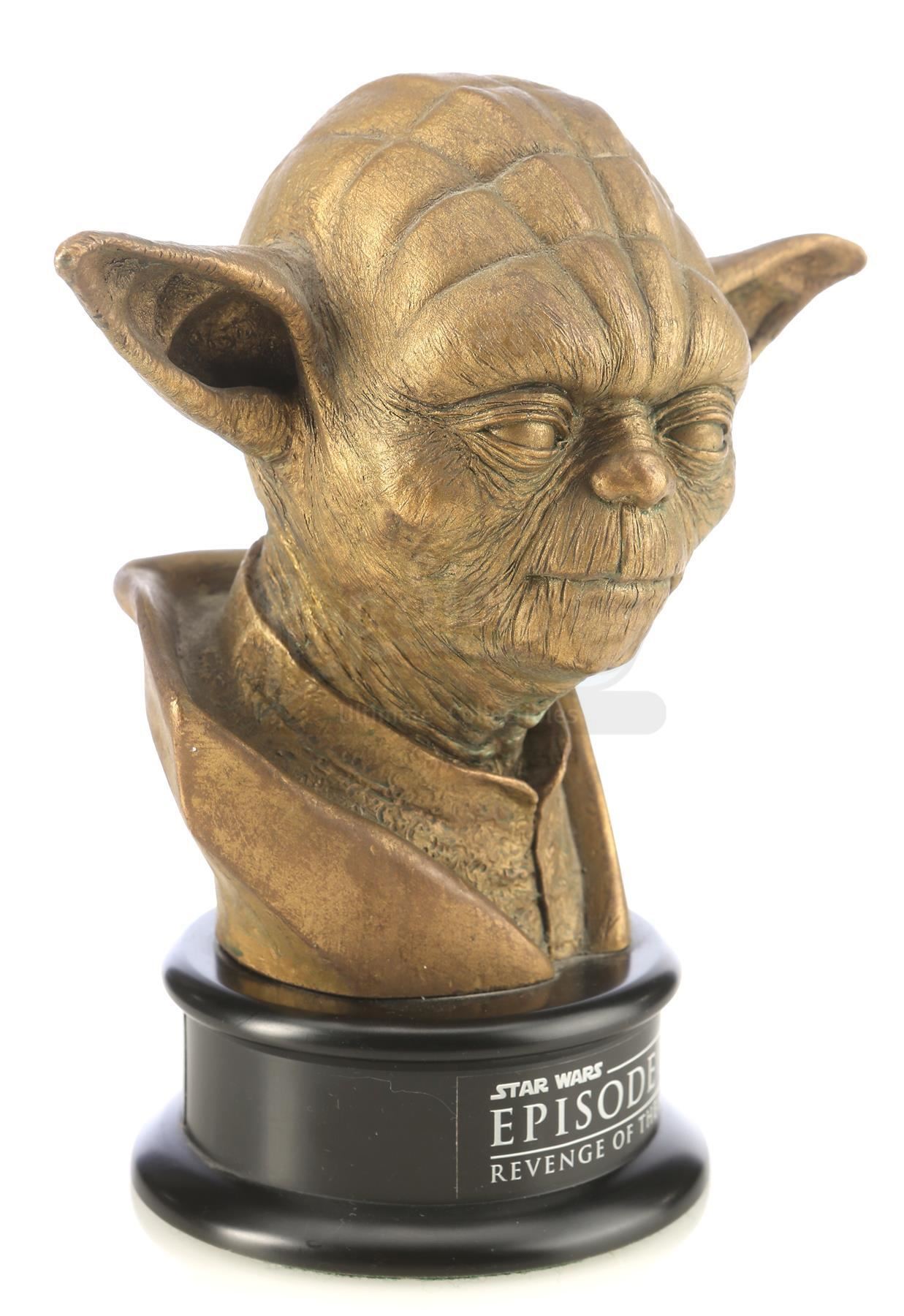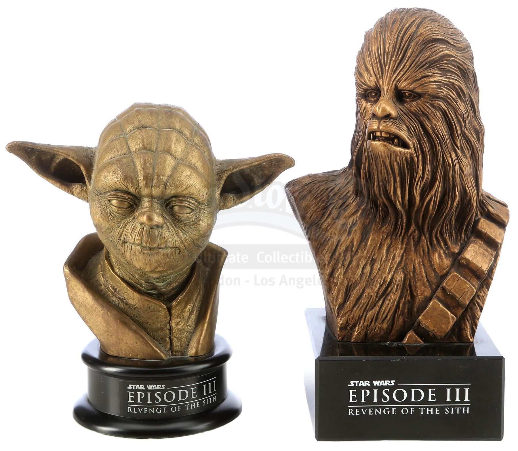 Both statues are composed of bronzetone resin with "R. Miller" carved on the reverse, as the busts were sculpted by ILM model maker Richard Miller. Chewbacca is mounted to black marble engraved with the film's title, while Yoda is mounted to green velvet-padded black urethane affixed with one "Revenge of the Sith" sticker and one "ILM Visual Effects Crew 2005" sticker. These crew gifts are in excellent overall condition with minor signs of handling. Dimensions (Chewbacca): 4" x 5 1/4" x 9" (10.25 cm x 13.5 cm x 23 cm); (Yoda): 4" x 6" x 7 1/2" (10.25 cm x 15.25 cm x 19 cm)