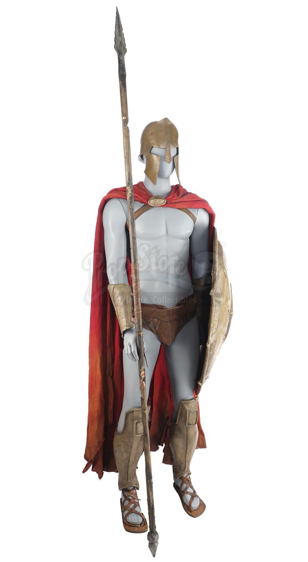 This lot includes a helmet, gauntlets, greaves, sandals, briefs, a cape, a shield, and a spear. The helmet is made of rubber with foam padding, painted to look like weathered bronze, and includes the name of stunt performer Mike Dopud handwritten inside. The matching gauntlets and greaves are made of urethane with foam padding and leather straps; and have the names of stunt performers Cody Laudan and Ryan Watson, respectively, written inside. The sandals, briefs, and the arm straps for the cape are made of brown leather, while the cape's buckle is bronzetone fiberglass and the cape is red-dyed canvas. The bronzetone, vacuum-formed plastic shield is weathered with simulated blood spatter and battle damage; while the rear of the shield features a brown canvas backing, leather and nylon straps, and a leather-bound handgrip. The spear is made of leather-wrapped wood, production-weathered, with a urethane head and resin rear, both painted gray to appear like dark metal. The lot is in good overall condition with some wear from production and age, including tearing in the back of the helmet, the front and back of the shield loosening from each other, the buckle loosening from the cape, and scuffing throughout.