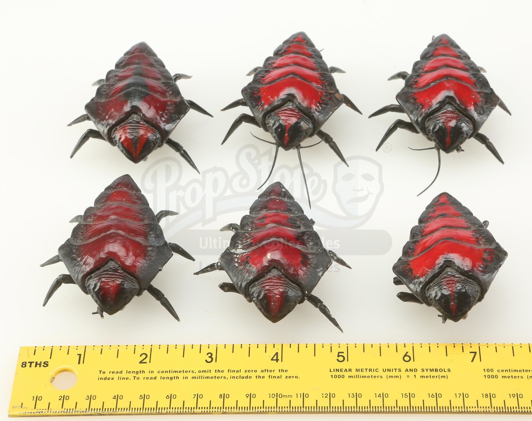 These heavily-detailed resin maquettes are hand-painted red and black with white underbellies. They have six legs, four front antennae, two mouth pincers, and two back antennae. The set is in good overall condition with various legs and antennae chipped off and some clay residue from use during production. Includes a letter of authenticity from Phil Tippett.