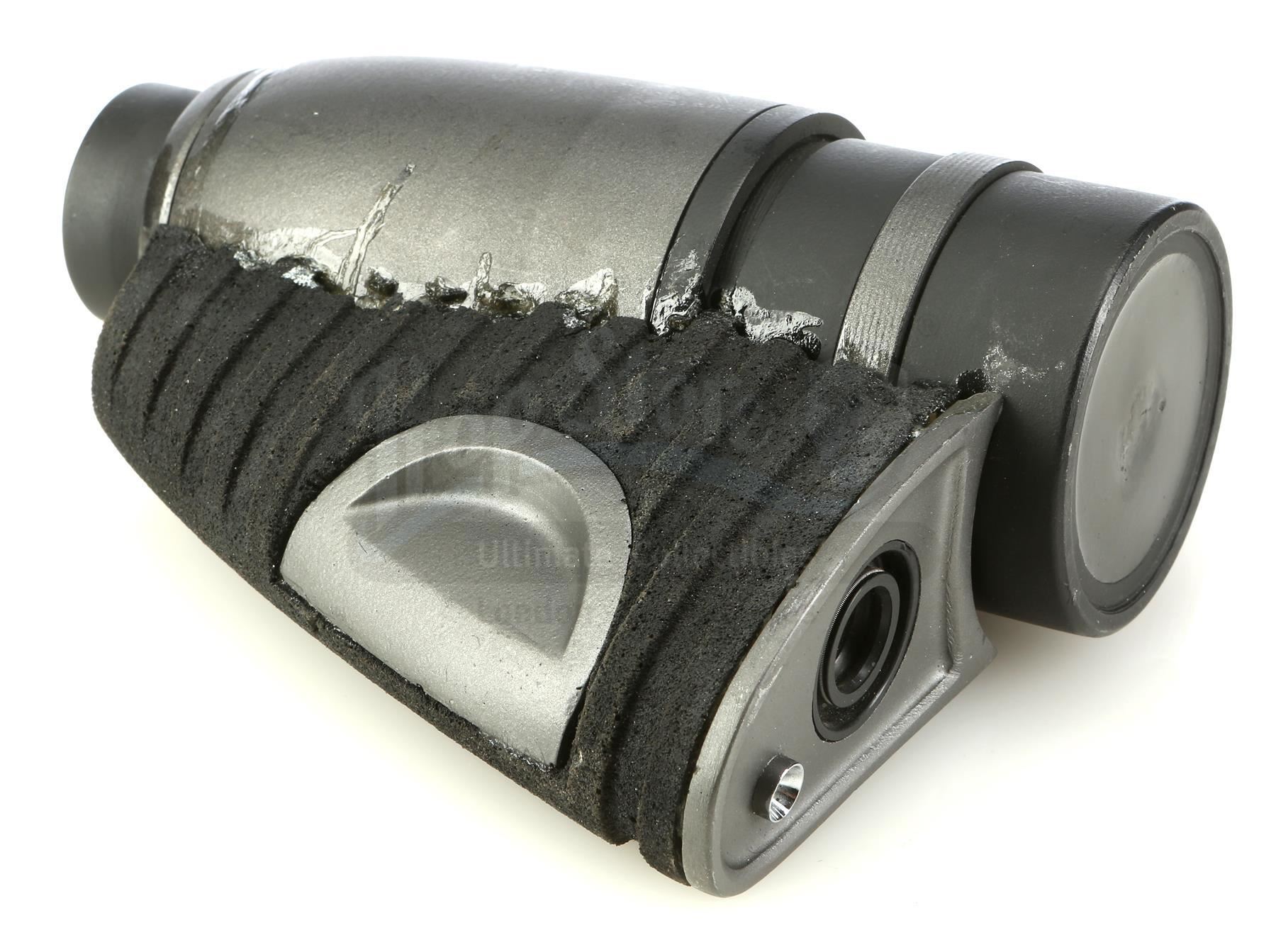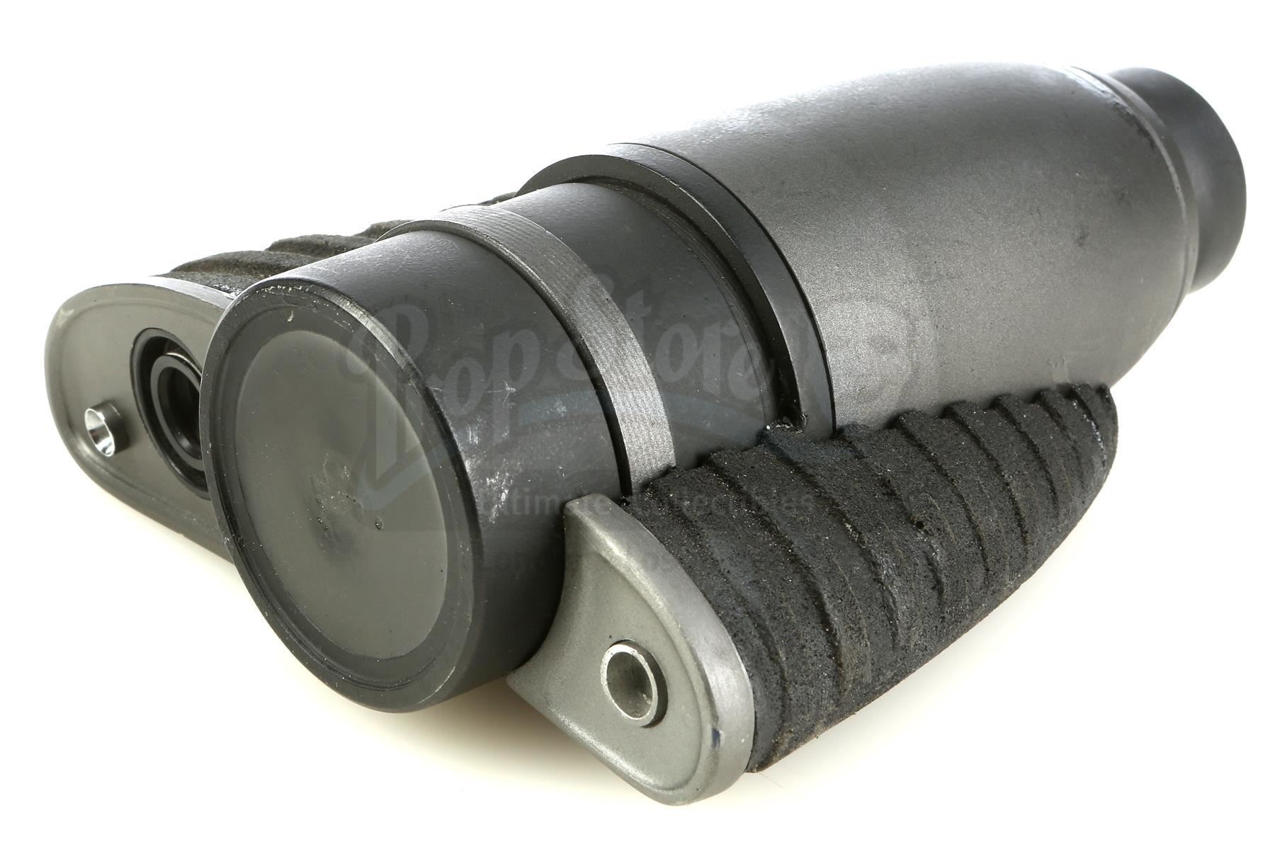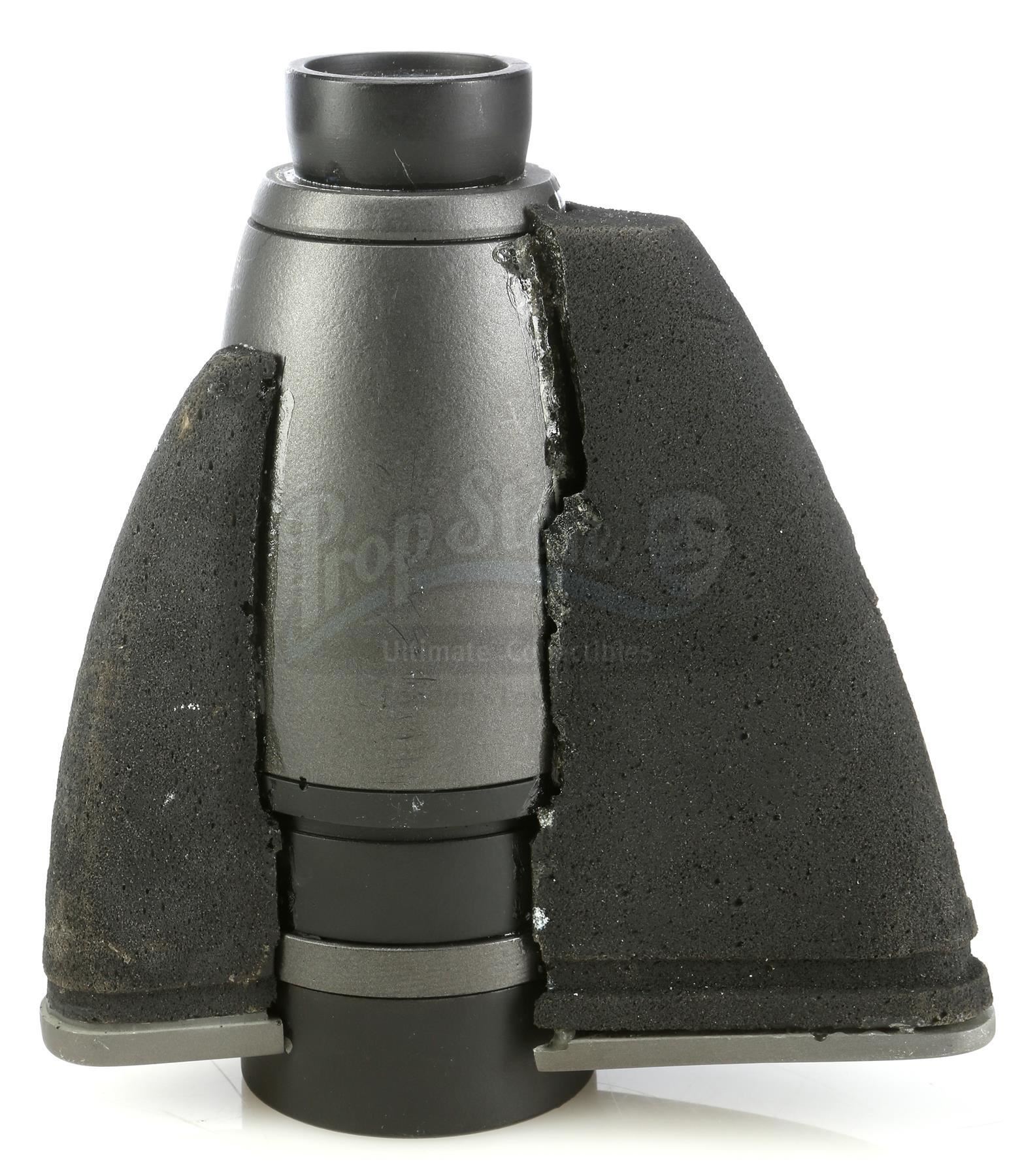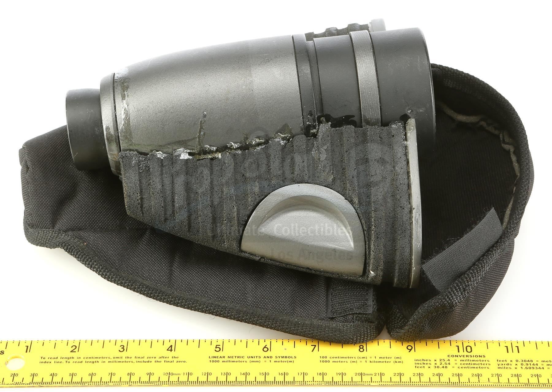 Captain Lola Beck's (Jolene Blalock) binoculars from Ed Neumeier's science fiction action sequel Starship Troopers 3: Marauder. Beck uses her binoculars while leading a group of marooned members of the mobile infantry on the desolate planet OM-1. These binoculars consist of a black and gray resin cylindrical base affixed with a pair of dense foam rubber elements of separate sizes. These non-functional binoculars are in good overall condition with some signs of production wear including marks on the eyepiece sections and separations where the elements meet the cylinder. Binoculars come complete in a black nylon and velcro case. Â