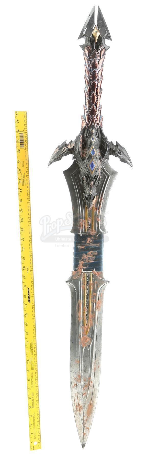 Lothar's (Travis Fimmel) hero clay-covered sword from Legendary Pictures' video game adaptation Warcraft. Lothar used his signature sword in combat to protect the planet Azeroth from an invasion of Orcs. The sword was covered in mud and grime during his fight with Medivh's (Ben Foster) Golem.