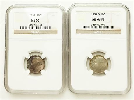 Lot of 2. 1957 MS-66 and 1957-D MS-66 FT Roosevelt Dimes NGC