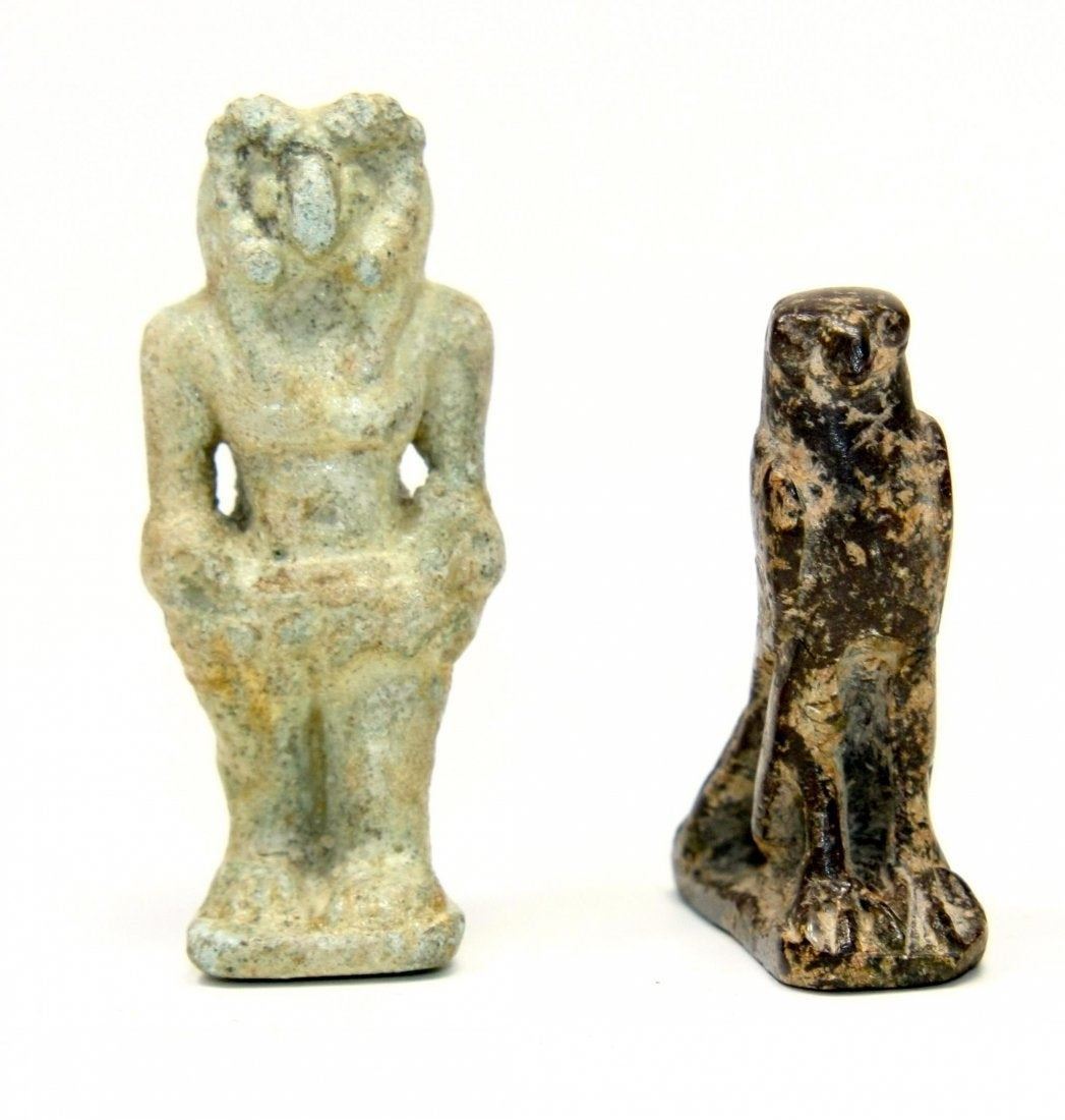 Lot of 2 Ancient Egyptian Amulets, Khnum, Horus. Khnum Amulet - Ex. US collection formed 1920-1932. Ex. Canadian collection 2011-2019. Ex. London collection acquired 2019. Size 2 inches high, together with Horus Amulet - Ex. US collection formed 1920-1932. Ex. Canadian collection 2011-2019. Ex. London collection acquired 2019. 1 3/8 inches high.