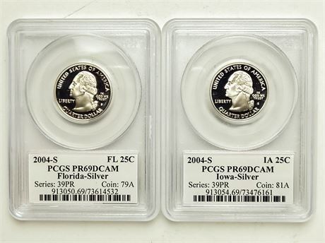 Lot of 2. Iowa Florida 2004-S Silver Proof Quarters PCGS PR-69 DCAM