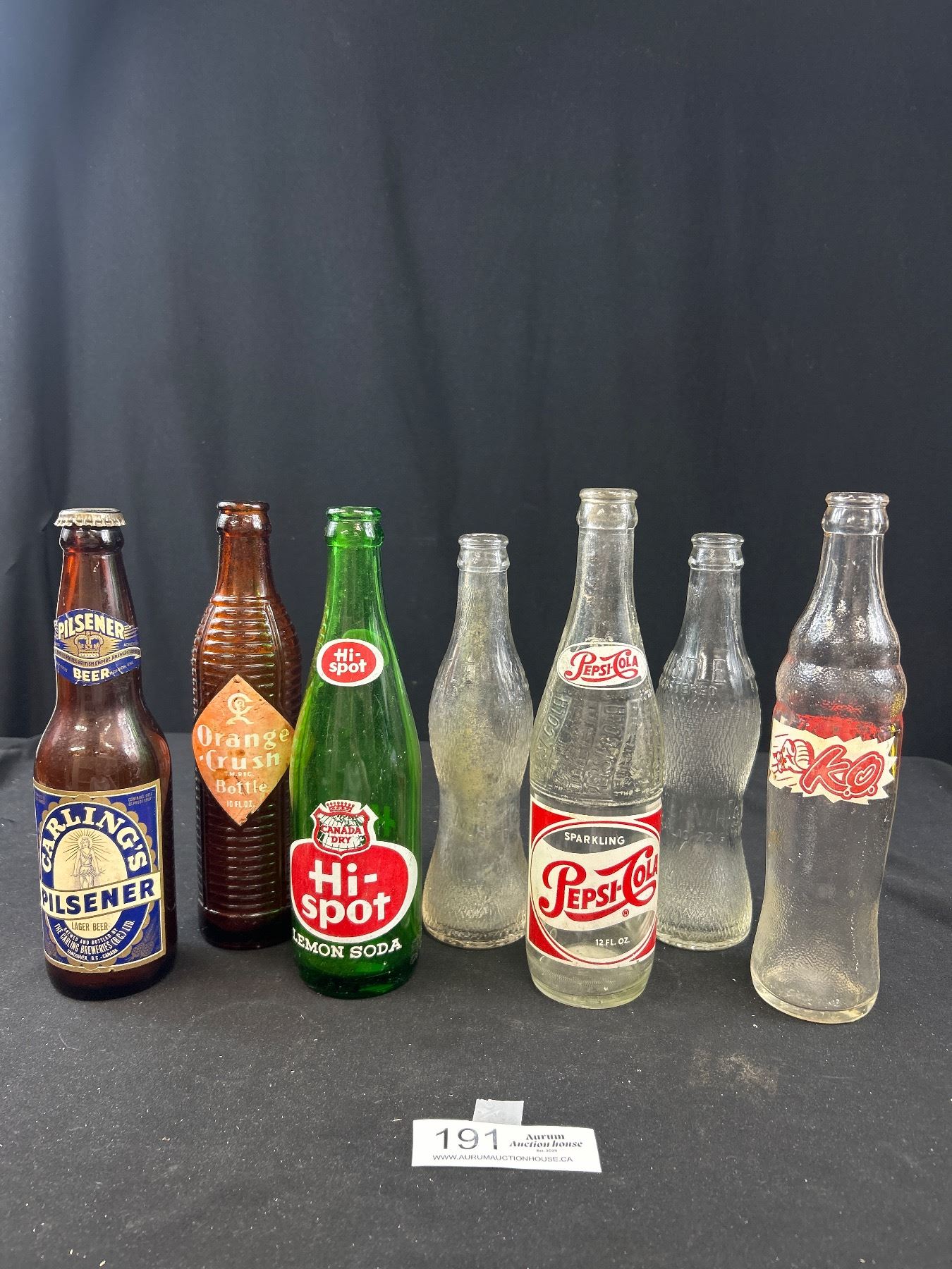 Lot of 7 Vintage Pop Bottles, Pepsi Cola, Orange Crush, Etc