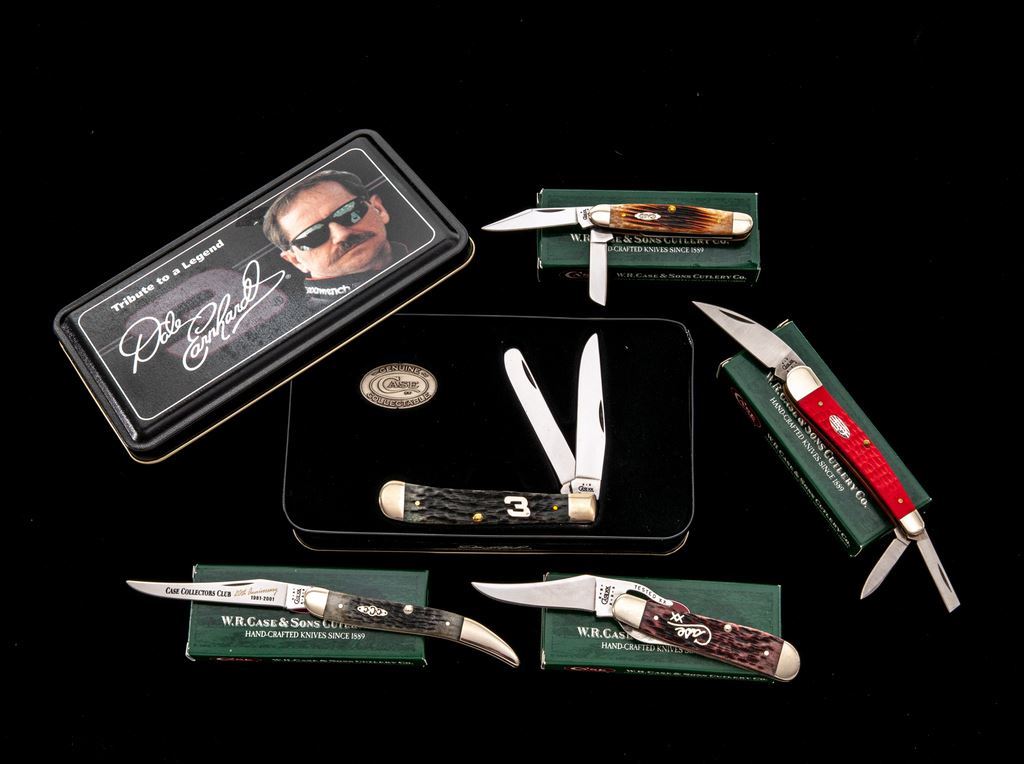 Lot of Five (5) NIB Case Folding Knives, including the following models and handle material: 1.) Model #6355WH SS, Seahorse pattern, Fire Engine Red bone, with box, mfg'd 2004. 2.) #61953L SS, Russlock pattern, Cranberry bone, with box, mfg'd 2001. 3.) #63090 SS, Stockman pattern, brown bone, with box, mfg'd 2007. 4.) Case Collector's Club 20th Anniversary #610094 SS, Toothpick pattern, black bone, commemorative markings on blade, with box (no end label), mfg'd 2001. 5.) Dale Earnhardt commemorative #6254 SS, Trapper Pattern, black bone, with a nickel silver "3" inlaid into the handle, in original collectible tin, mfg'd 2003. The Stockman pattern knife has a few scratches near one of the nail nicks, otherwise all the knives are in new condition, with a few slight handling marks. Est.: $250-$450/lot.