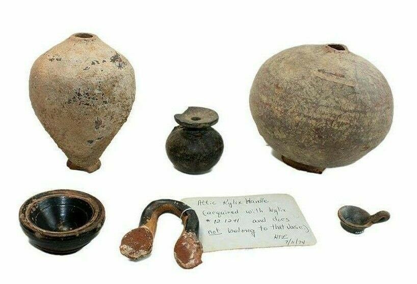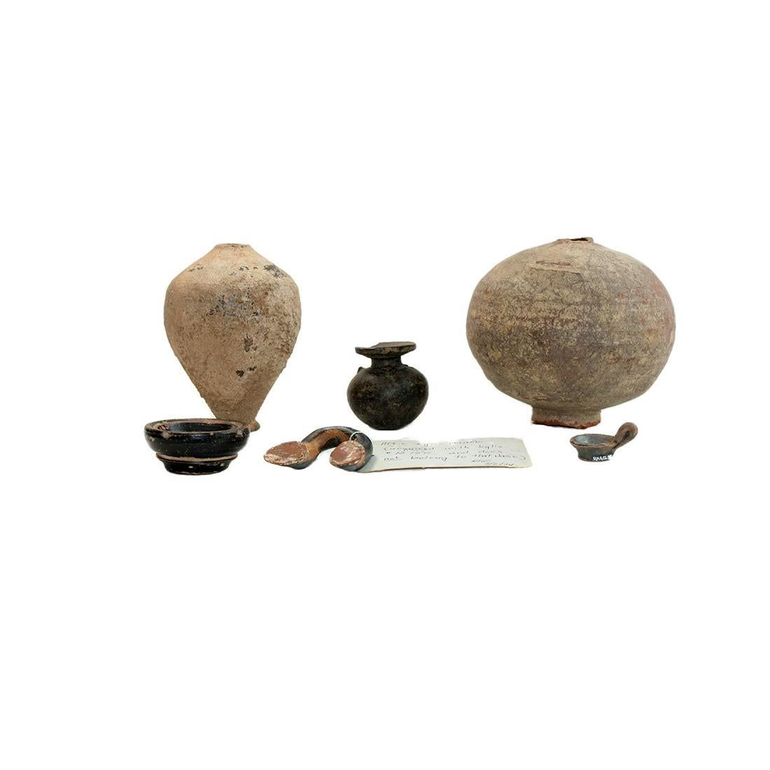 Lot of Greek/Roman Pottery Antiquities Ex Toledo Museum. Size 1 1/2 - 4 1/2 inches. Consist of South Italian Pottery Aryballos, Miniature bowl and Kylix handle together with two Roman Terracotta Vessel fragments.