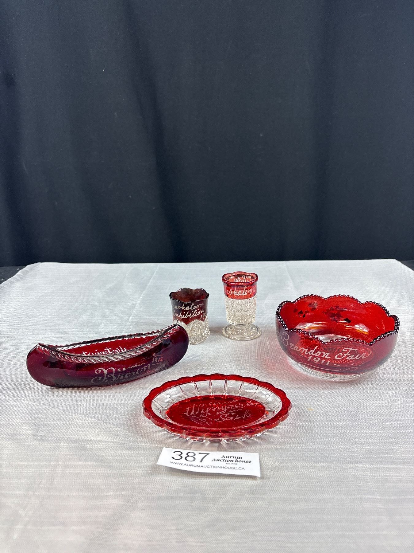 Lot of Turn Of The Century Souviner Cranberry Glass New Westminister 1911 Brandon Falls etc.