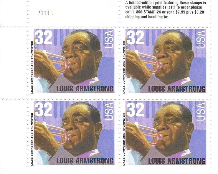 Louis Armstrong stamps 4 x 32 cent stamps plate block