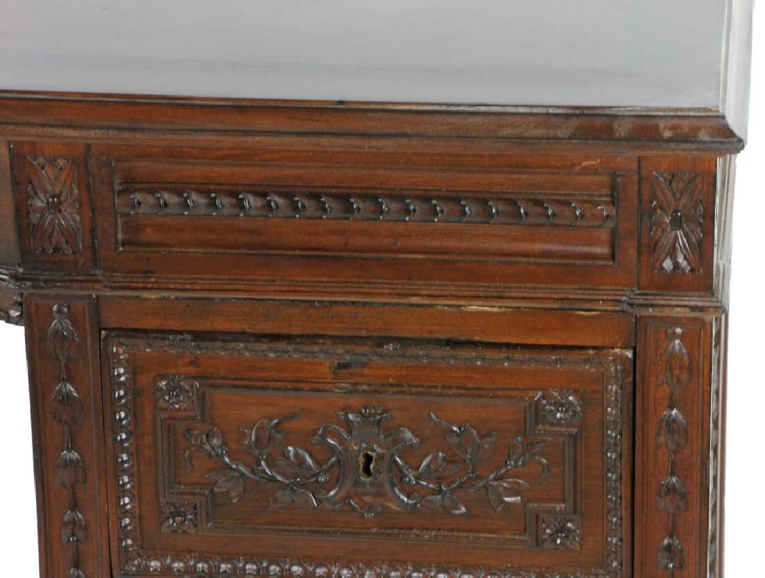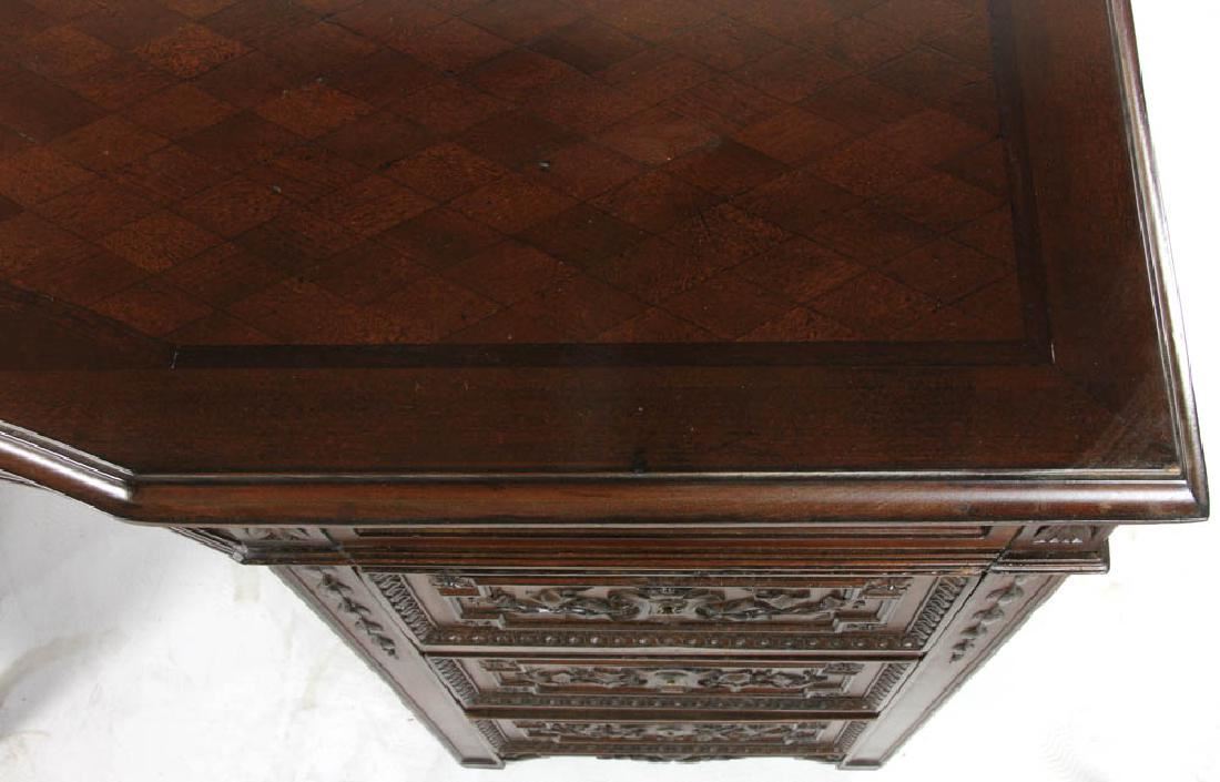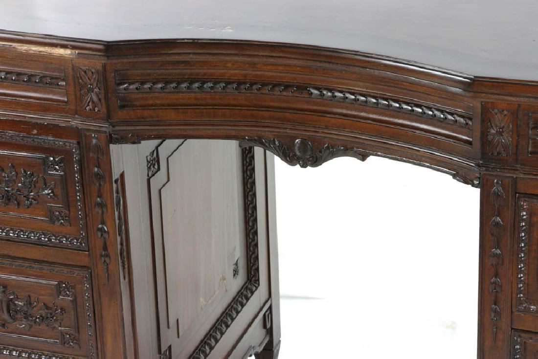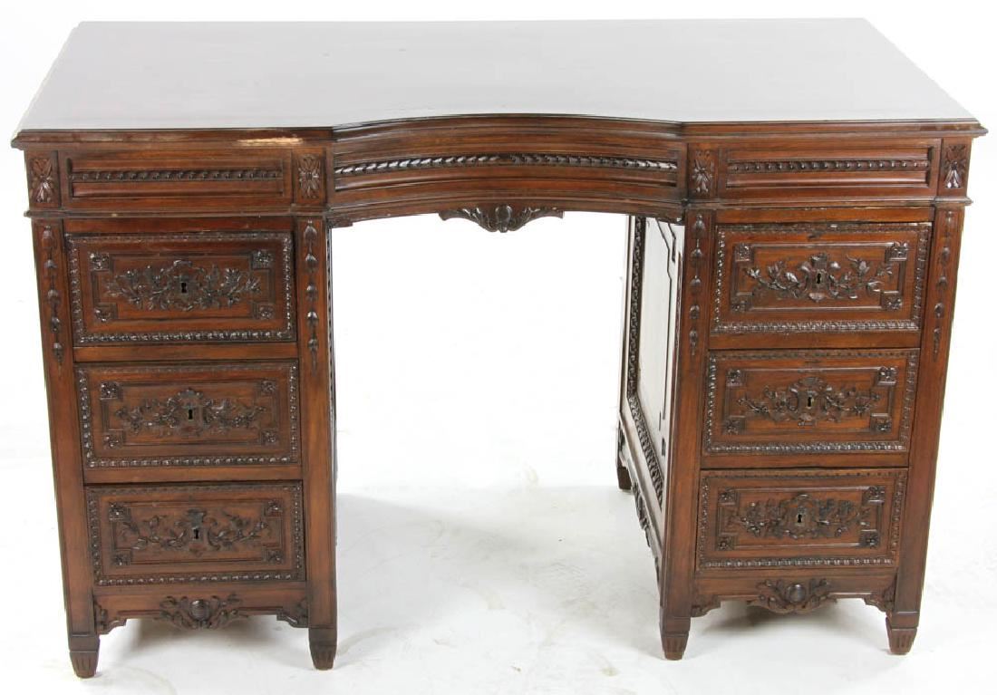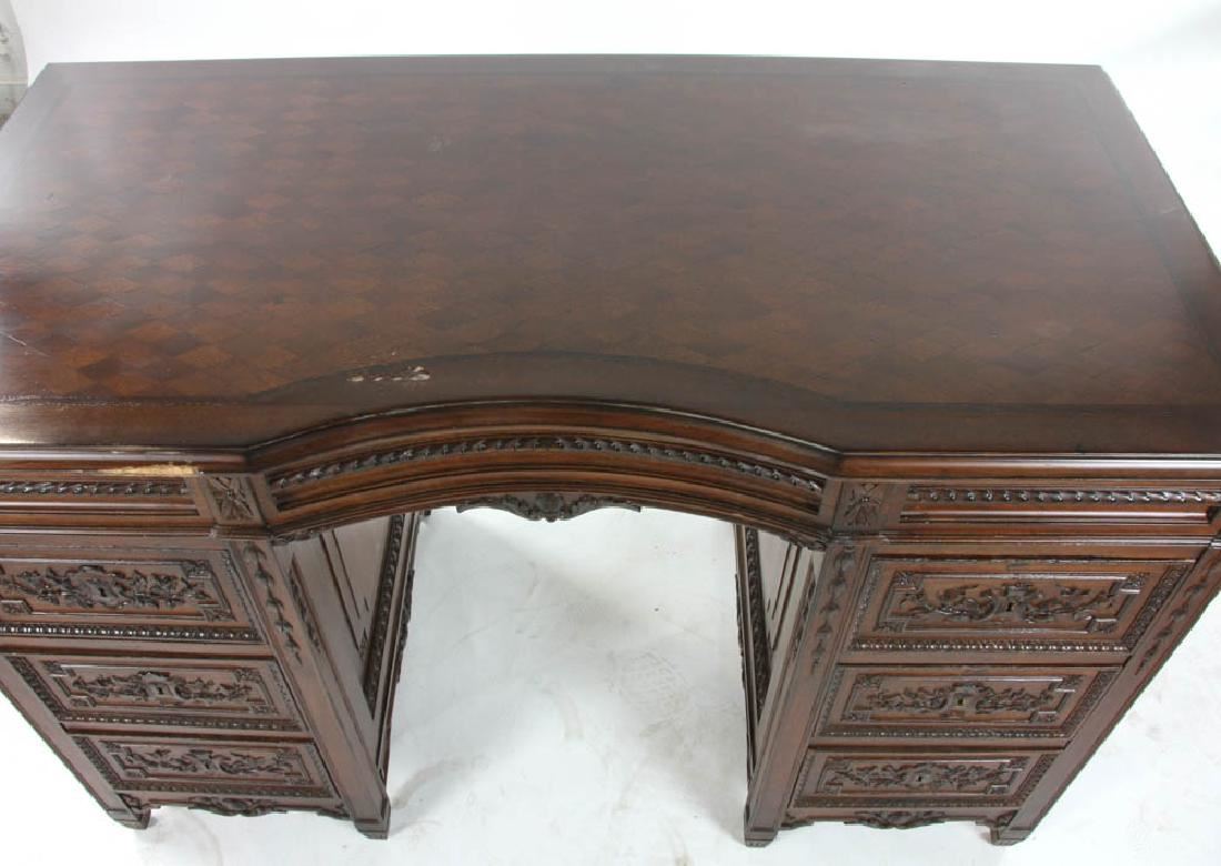 Louis XVI-style carved mahogany and parquetry inlaid desk, circa 1900, 31" H x 47" W x 24" D. Provenance: New York estate.
