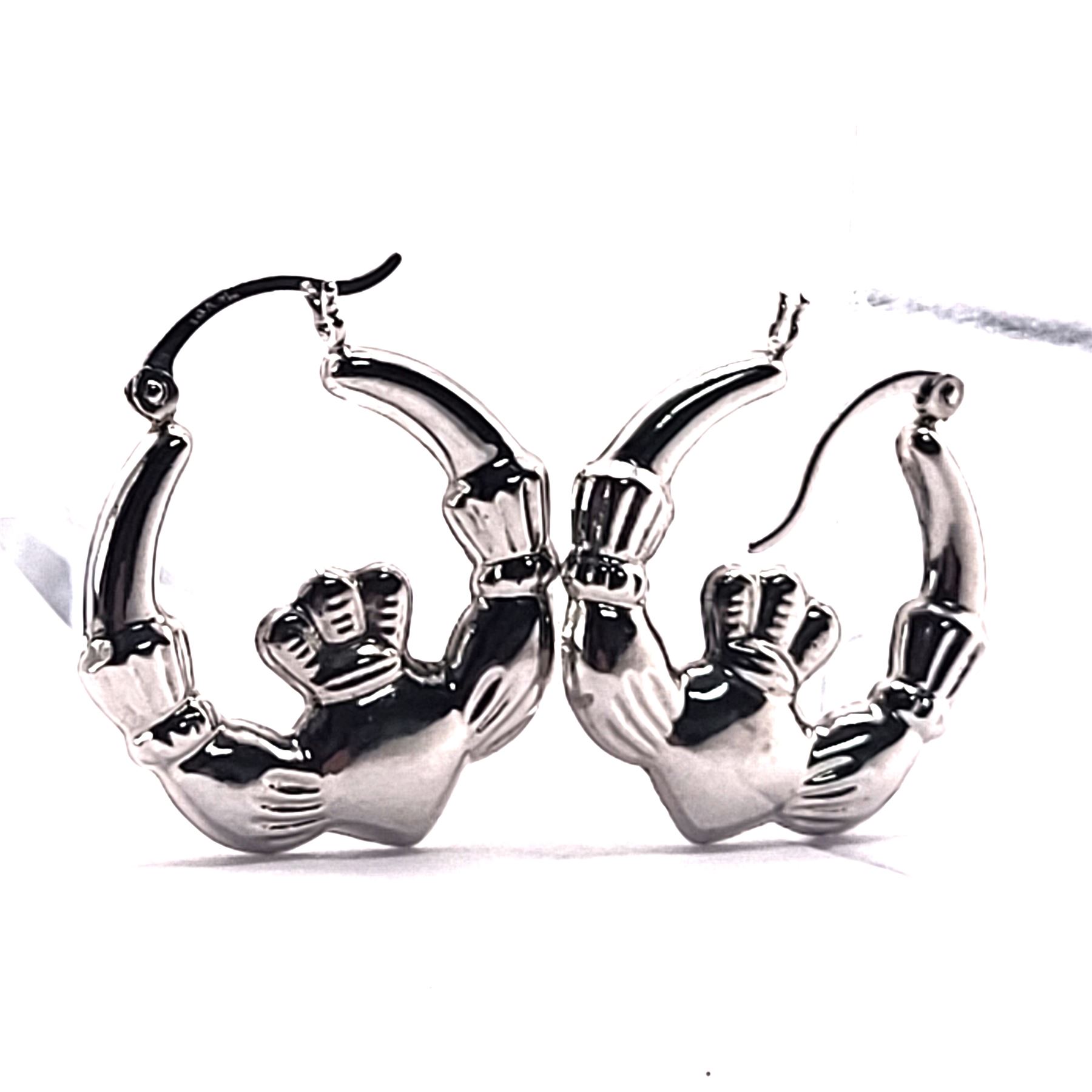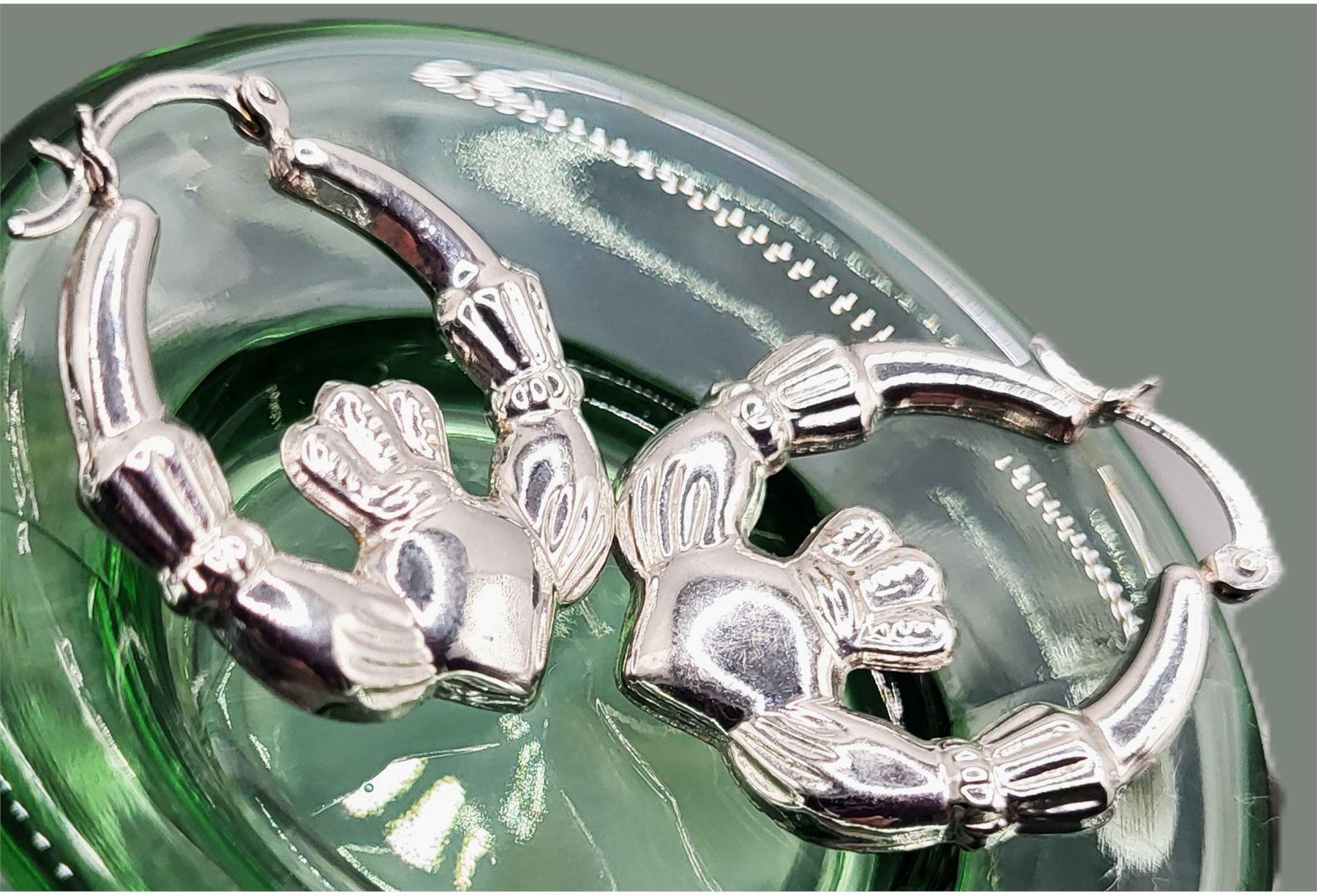 The claddagh is worldwide recognized symbol of love that originated in Ireland nearly 500 years ago! (Read more about the claddagh below.) These 14 karat white gold hoop earrings are designed as & quot;Claddagh& quot; symbol and have hinged bar closures.& nbsp; They are approximately 1& quot; diameter and weigh& nbsp; 2.9 grams total (just over one gram each) for a light, comfortable wear. .& nbsp; Admin: 33110/27ea
