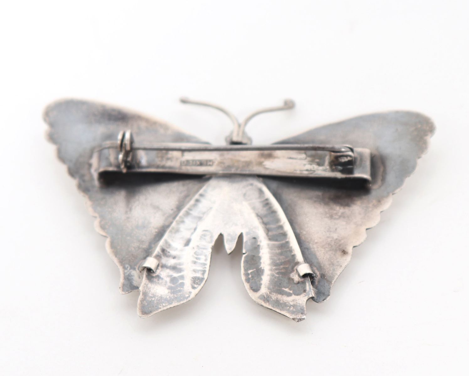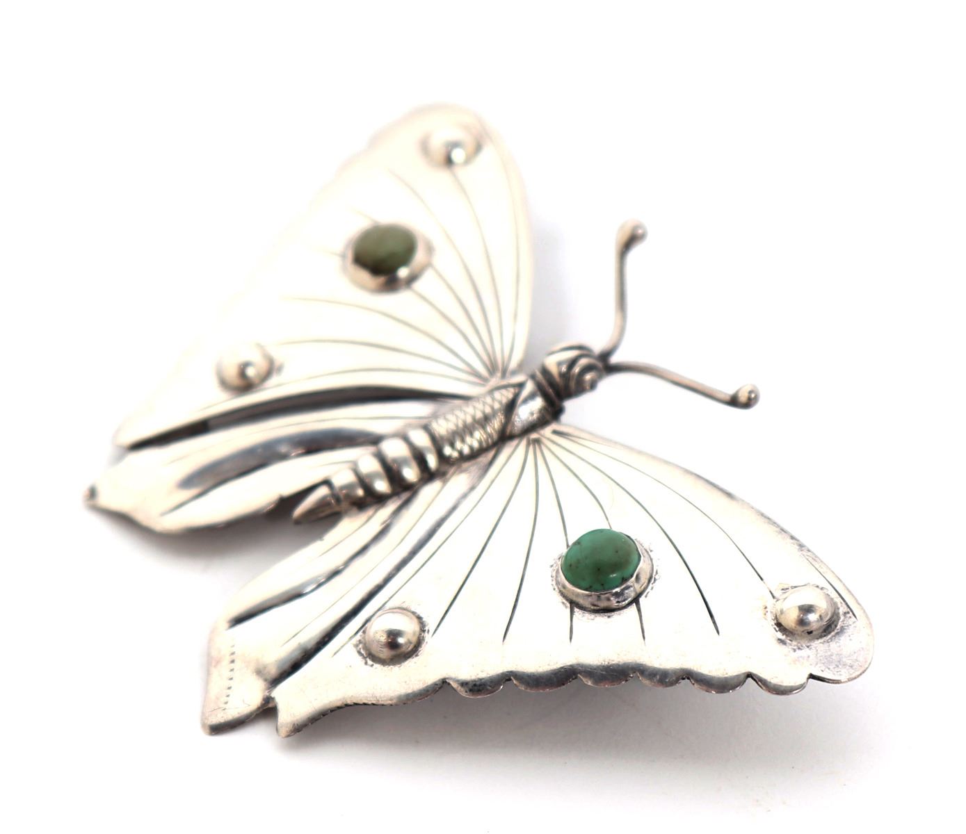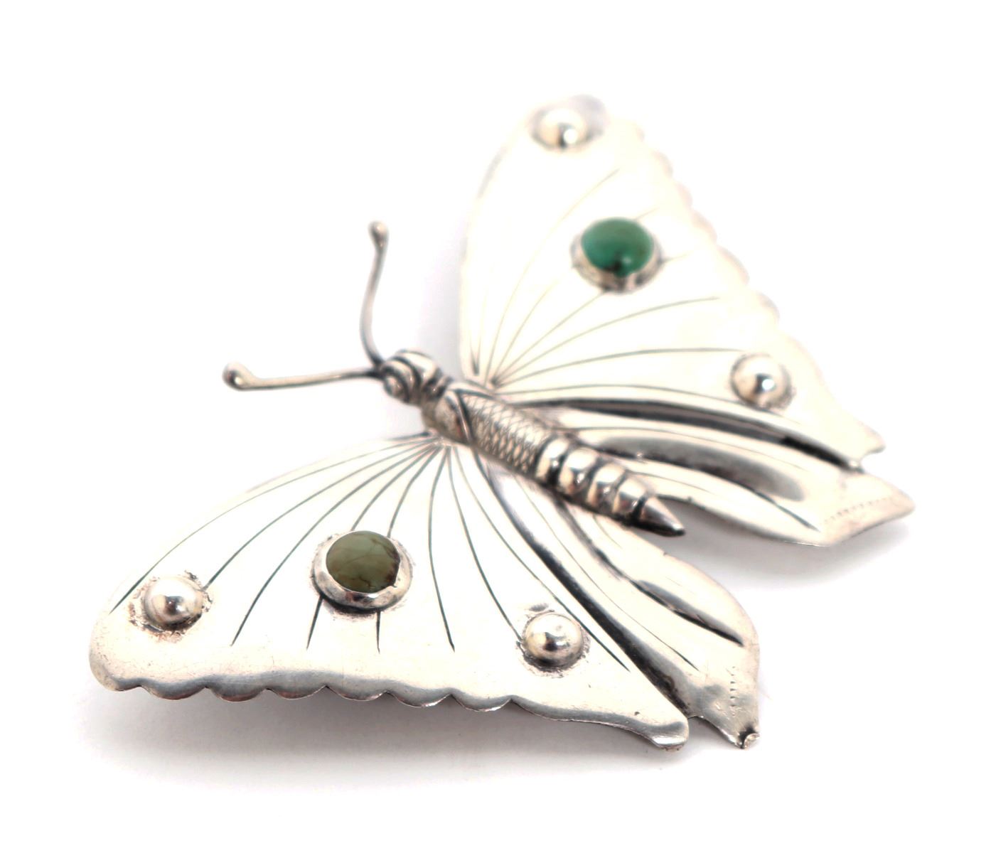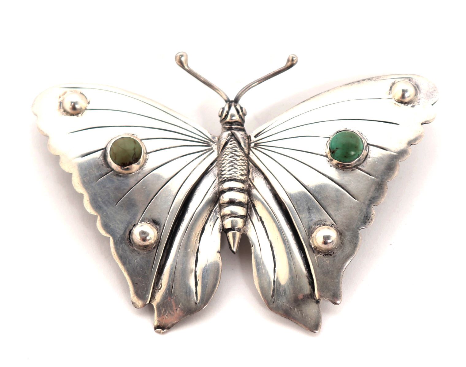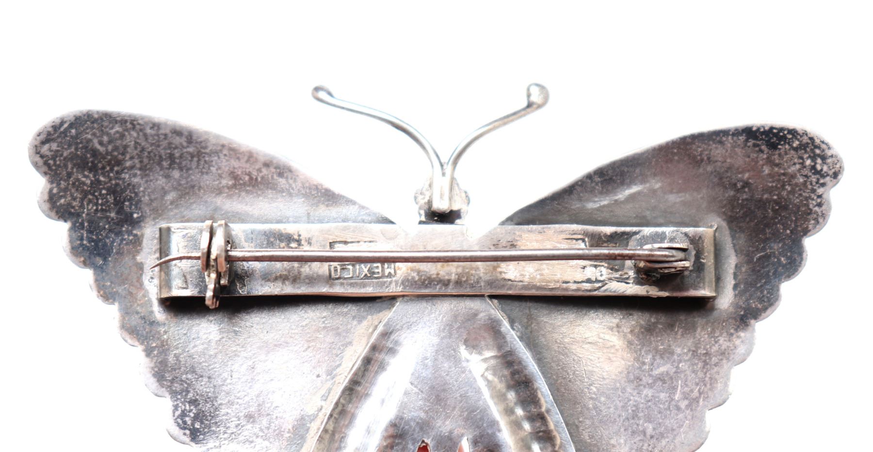Finely hand crafted sterling silver butterfly with two turquoise inlayed beads to each wing. Body wonderfully crafted with long antennae, bulbous eyes, and striped wings. Underside marked Mexico. Size 3 1/4" W. Condition: Wearable condition throughout.