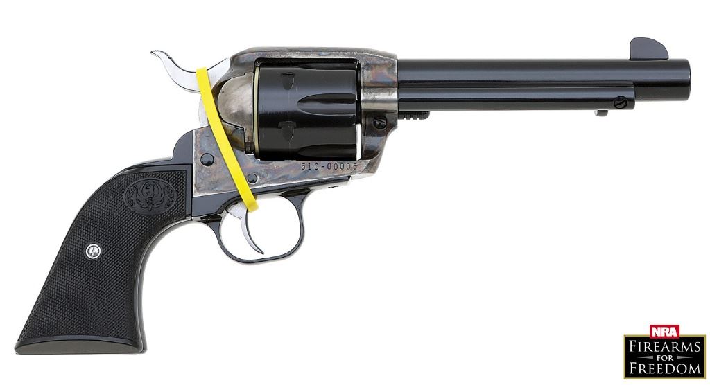serial #510-00005, 45 Colt, 5 1/2" barrel with a bright excellent bore. The metal surfaces retain 99% original blue and 95-97% factory case-colors, showing minimal handling wear, scattered light oxidation staining along the frame under direct light, and the loading gate and base of the ejector rod housing toning to a smoky case-hardened patina. The checkered black synthetic grips rate excellent showing minimal handling wear. Timing and lockup are presumed excellent as the gun retains the factory ziptie and included is the matching factory plastic hardcase, manual, and factory fired case. This remains a handsome and overall high-condition New Vaquero, in a sweet spot to please either the shooter or the collector. (26A11608-355) {MODERN} [N.R.A. Firearms For Freedom] (700/900)
