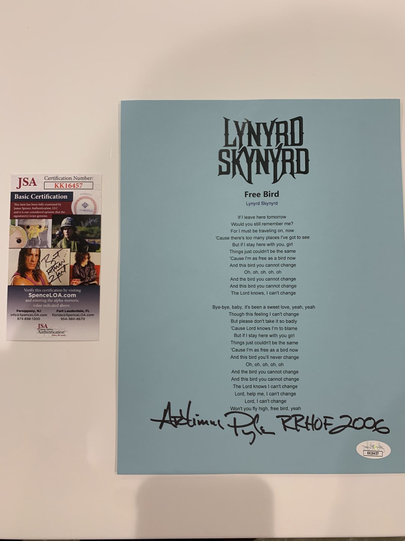 Lynyrd Skynyrd signed Artimus Pyle Freebird lyrics. Itemis 8.5 x 11 inches and signed n person in 2006. Item is inscribed RRHOF 2006
