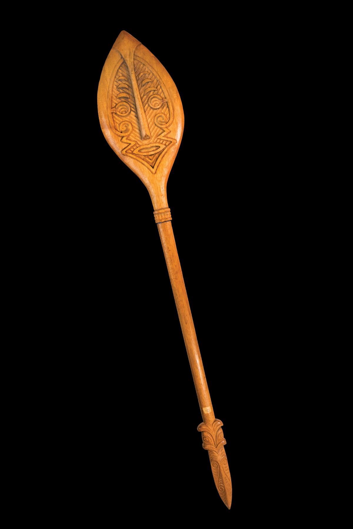 (1960s) Another war club design master pattern by George Nakashima for Armet & Davis' Philadelphia KONA-KAI. This club features a warrior mask carving in the paddle area...complete Poly-Pop fantasy by Mr. Nakashima! Cass Carving. 58"x10" VG+.